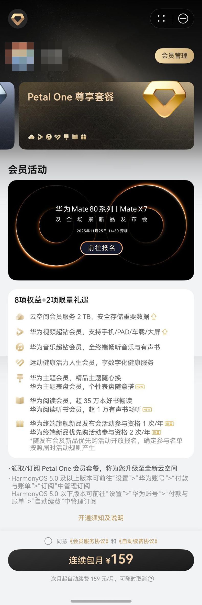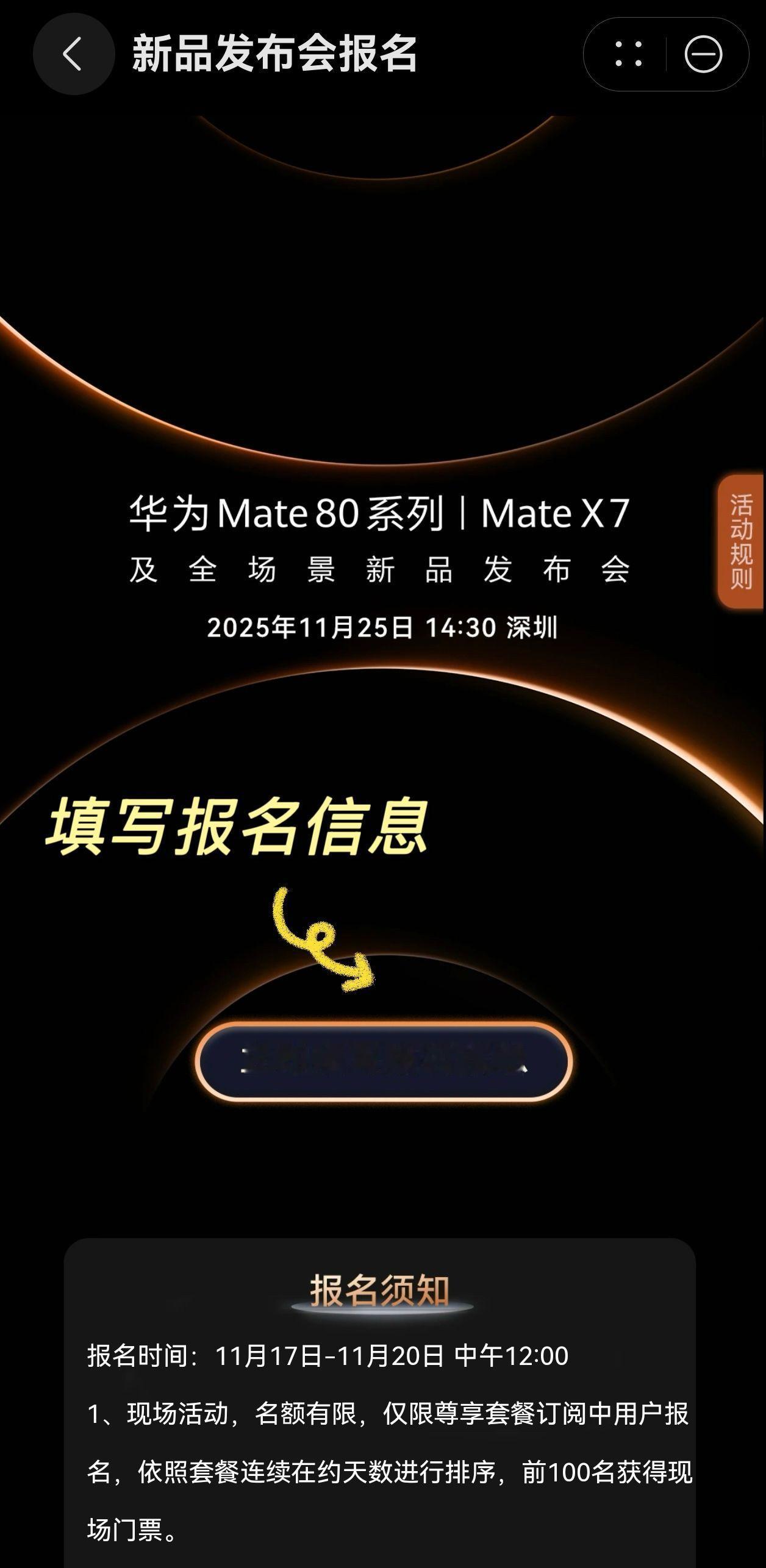华为年度备受期待的新品发布会官宣啦🎉 11月25日14:30 Mate80系列+Mate X7齐亮相,这波旗舰阵容真的把我蹲疯了!作为Petal One尊享套餐老粉必须安利:不仅能解锁2TB云空间、全终端视频/音乐超钻会员外,每年还有1次旗舰发布会参与资格!现在报名通道已开,11月17-20日中午12点前,去负一屏搜“尊享”点击进入,填写报名信息,即可报名成功!接着等消息是否获得资格,就是这么so easy!现在新用户订阅尊享套餐还送影视VIP年卡,用华为视频手机、车载、大屏都能看,新用户真的血赚~ 想冲现场或蹲新品优先购的宝,赶紧冲套餐锁资格,一起去华为这场科技盛宴呀!升级鸿蒙5.1及以上的用户还可以在负一屏领,每日签到有超多会员权益~