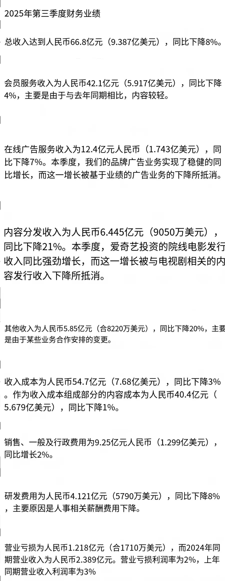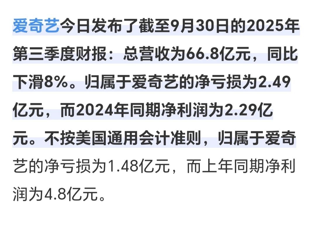 爱奇艺第三季度电视剧板块亏损实锤了。不是两个破万剧吗?不仅没挣到钱,竟然还亏了。稀奇。 爱奇艺第三季度财报亏损1.48亿
