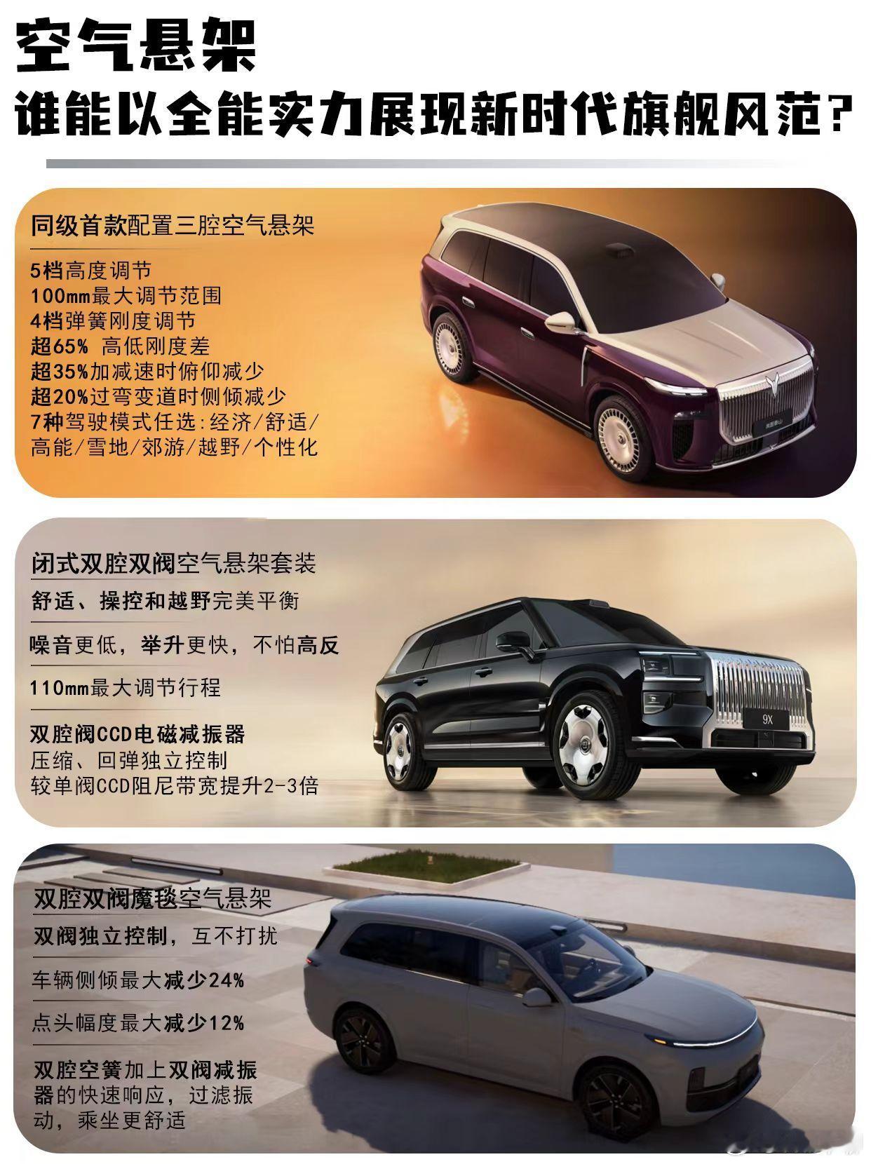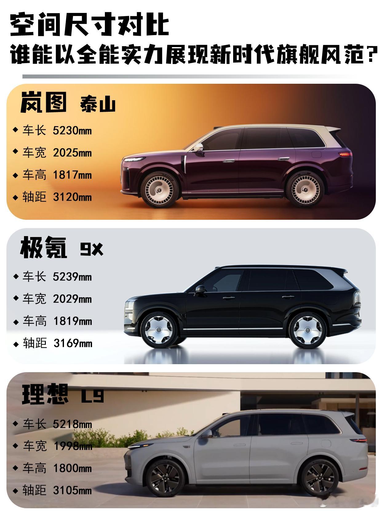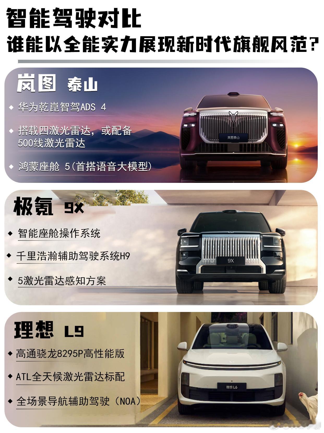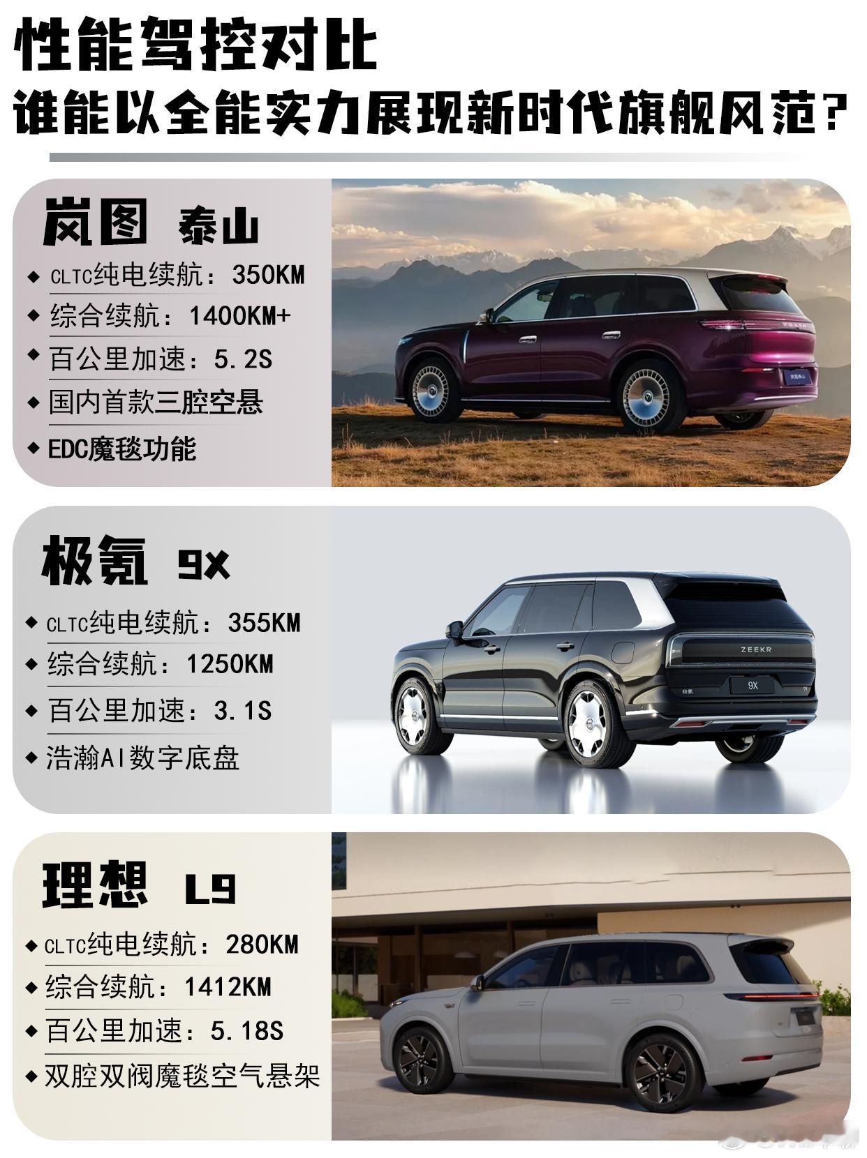 🔥最近大型豪华SUV市场可谓神仙打架!极氪9X、理想L9等热门车型让人眼花缭乱,如今岚图泰山也即将重磅登场。今天就从三个核心维度,看看这三款车究竟谁更胜一筹。⭐【尺寸空间】⭕岚图泰山在5230mm的优越车长基础上,实现了86.8%的行业领先"得房率",二排舒享大四座模式注重空间实用性与灵活性,拥有全舱舒享体验,重新定义了旗舰 SUV 的座舱标准。⭕极氪9X凭借3169mm的同级领先轴距,打造了优越的二排腿部空间,配合剧院式布局,确保每位乘客都能享受开阔的视野。⭕理想L9则通过其黄金比例车身,配合3105mm轴距,实现了三排均等的空间分配,将座舱打造成了真正的移动家庭娱乐中心。⭐【智能科技】⭕岚图泰山搭载华为乾崑智驾ADS 4,搭载四激光雷达,或配备500线激光雷达,显著提升了感知精度,使其具备应对复杂城市路况的能力。⭕极氪9X采用双NVIDIA Thor芯片,算力高达2000TOPS,配合5激光雷达感,构建了强大的智能驾驶硬件基础。⭕理想L9则搭载高通8295P高性能版芯片,配合其深度优化的智能座舱系统展现出了出色的流畅度和响应速度,为家庭用户提供了丰富的智能体验。⭐【性能驾控】⭕岚图泰山构建了800V+5C超充+三腔空气悬架的全域技术闭环。充电12分钟补能228公里,综合续航超1400公里。同时搭载三腔空悬,提供5档高度、4档刚度调节等等优势实现全场景智能自适应,兼顾豪华舒适与精准操控。⭕极氪9X采用全栈900V混动高压架构,配合6C最大充电倍率,实现了优越的补能效率,其底盘调校与动力输出,带来激情澎湃的驾驶感受。⭕理想L9搭载魔毯空气悬架系统,配合精准的CDC连续可变阻尼调节,提供平稳舒适的驾乘体验,1412km的综合续航,解决了家庭用户的里程焦虑。⚠️【总结】极氪9X,理想L9延续了其作为家庭用车的均衡特质,岚图泰山则在华为智驾系统、三腔空悬与空间设计上形成了自身特色,展现出旗舰的豪华实力。大家可根据自身用车场景与偏好,做出更合适的选择。