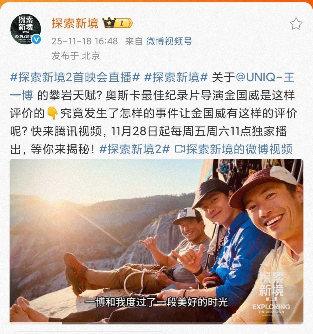 关于王一博的攀岩天赋,和王一博合作户外探索纪实纪录片《探索新境2》的奥斯卡最佳纪
