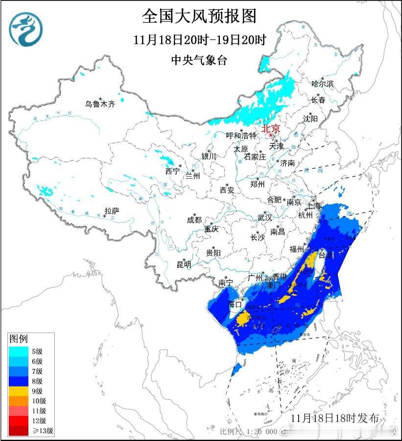 【大风】未来寒潮对我国陆地影响区域结束,但还会导致东海南部到南海中北部出现大风天气。另外19-20日还有补充冷空气东移,导致内蒙古等地风较大。今晚中央气象台继续发布大风蓝色预警:预计,11月18日20时至19日20时,内蒙古中东部、河北北部、福建东部沿海、广东南部沿海、广西东南部沿海以及西藏中西部等地将有5~6级风,阵风7~8级;东海南部海域、台湾海峡、台湾以东洋面、巴士海峡、南海北部和中部海域、琼州海峡、北部湾将有7~8级、阵风9~10级的大风,其中台湾海峡、台湾以东洋面、巴士海峡、南海东北部和中部的部分海域风力可达9级、阵风10~11级。11月19日20时至20日20时,内蒙古中东部、辽东半岛、山东半岛、福建东部以及西藏西部等地将有5~6级风,阵风7~8级;台湾海峡、台湾以东洋面、巴士海峡、南海北部和中部海域、北部湾偏南海域将有7~8级、阵风9级的大风。