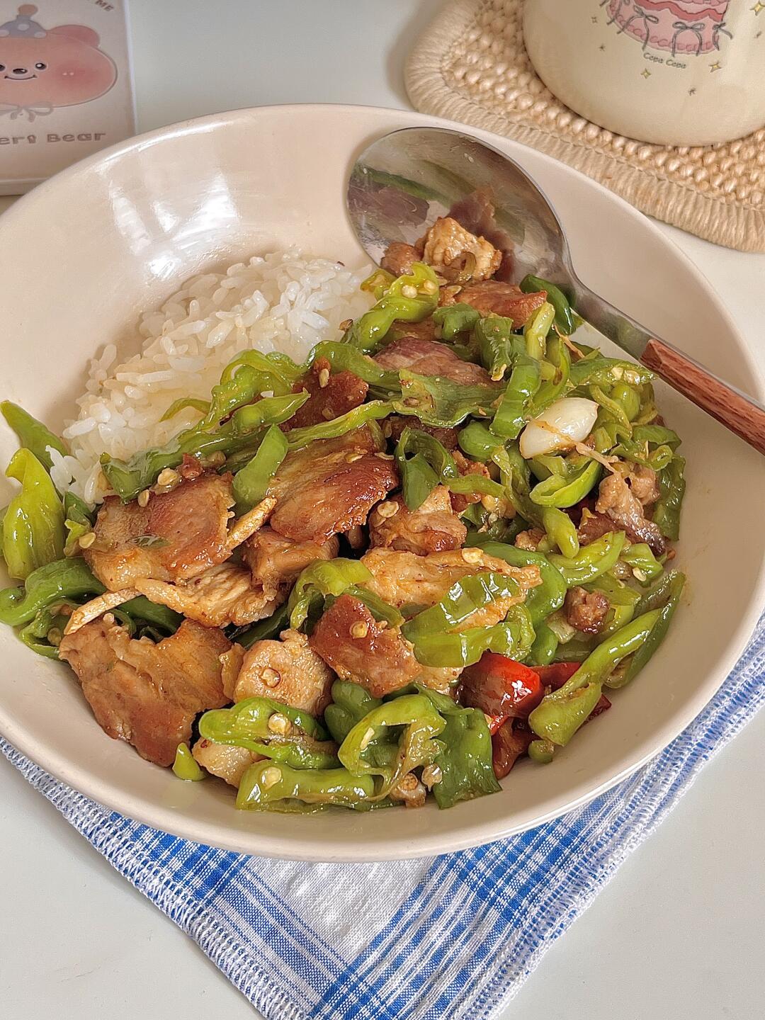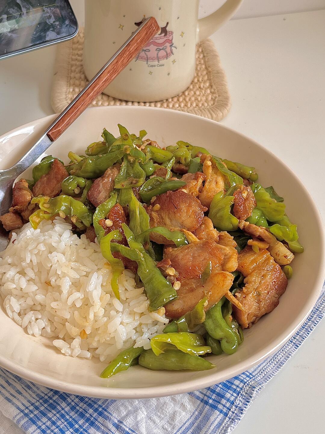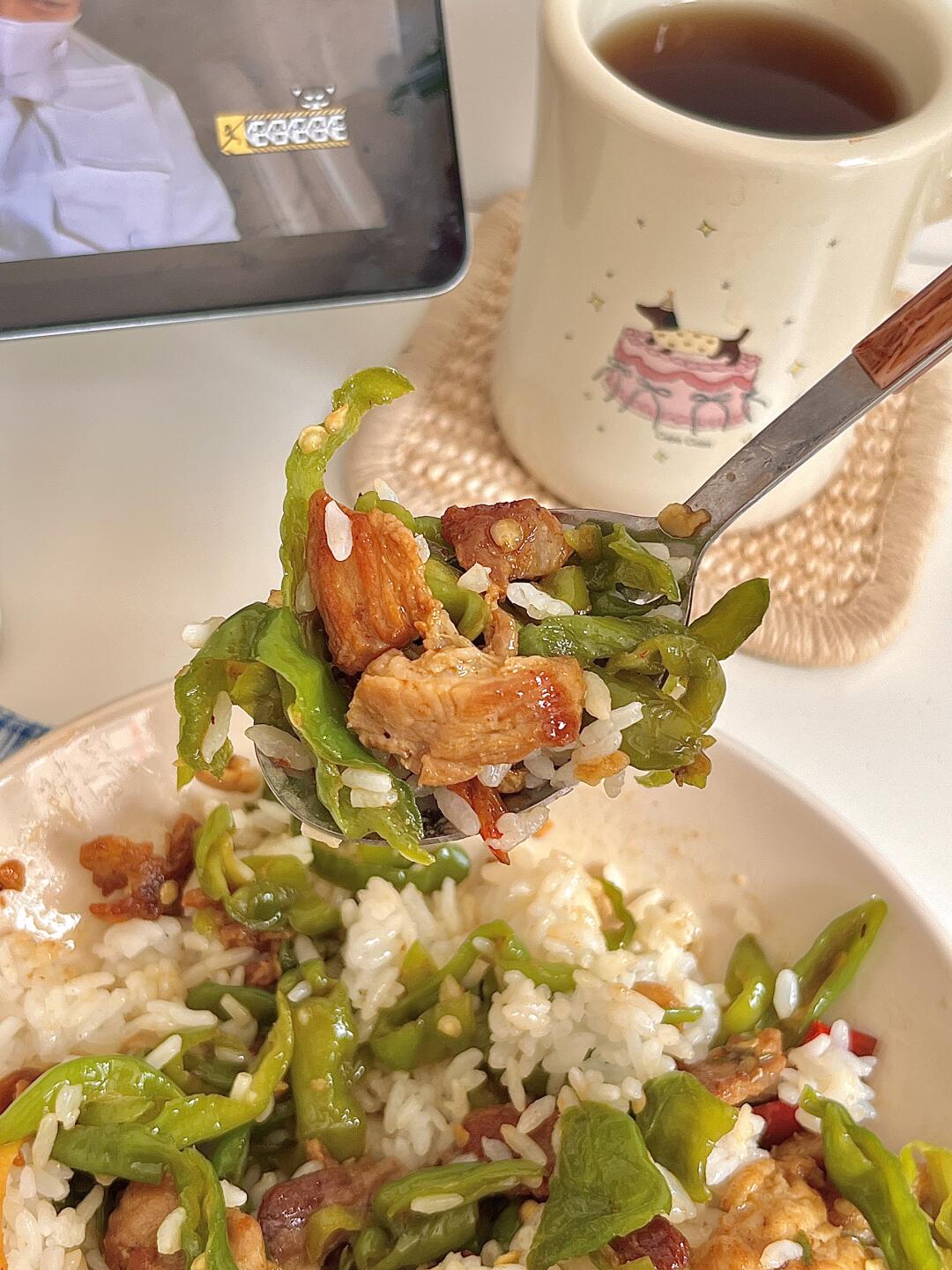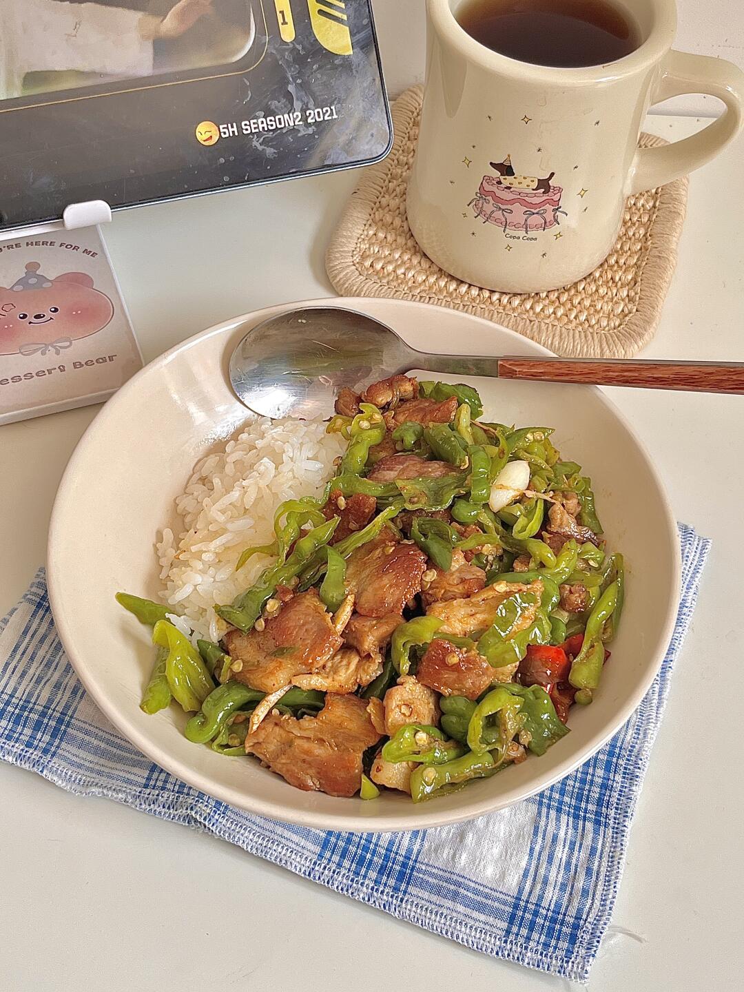 我逐帧复刻一饭封神同款 🍴今日份一人食: 辣椒炒肉盖饭 玉米须茶🍵 . 辣椒炒肉算是下饭家常菜的天花板了吧! 香辣香辣的实在太香了😋辣椒多放些,五花肉煸炒焦焦的,一点也不腻 超级下饭,干饭人谁能拒绝这一道菜,爱吃的宝快去试试呀✌🏻