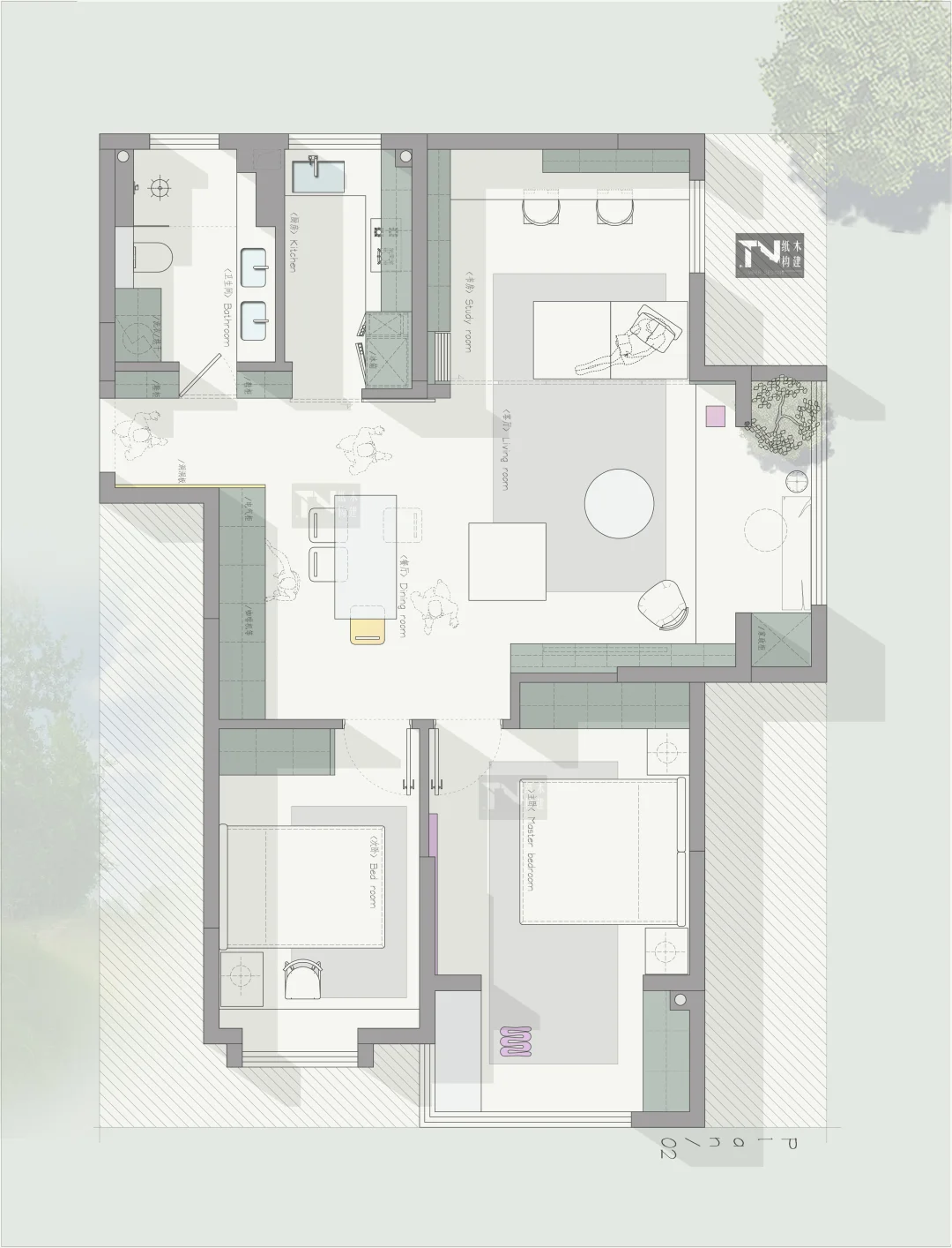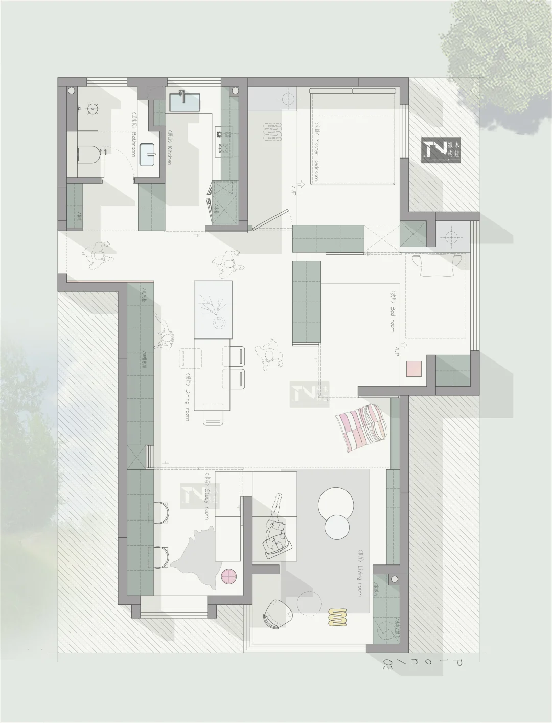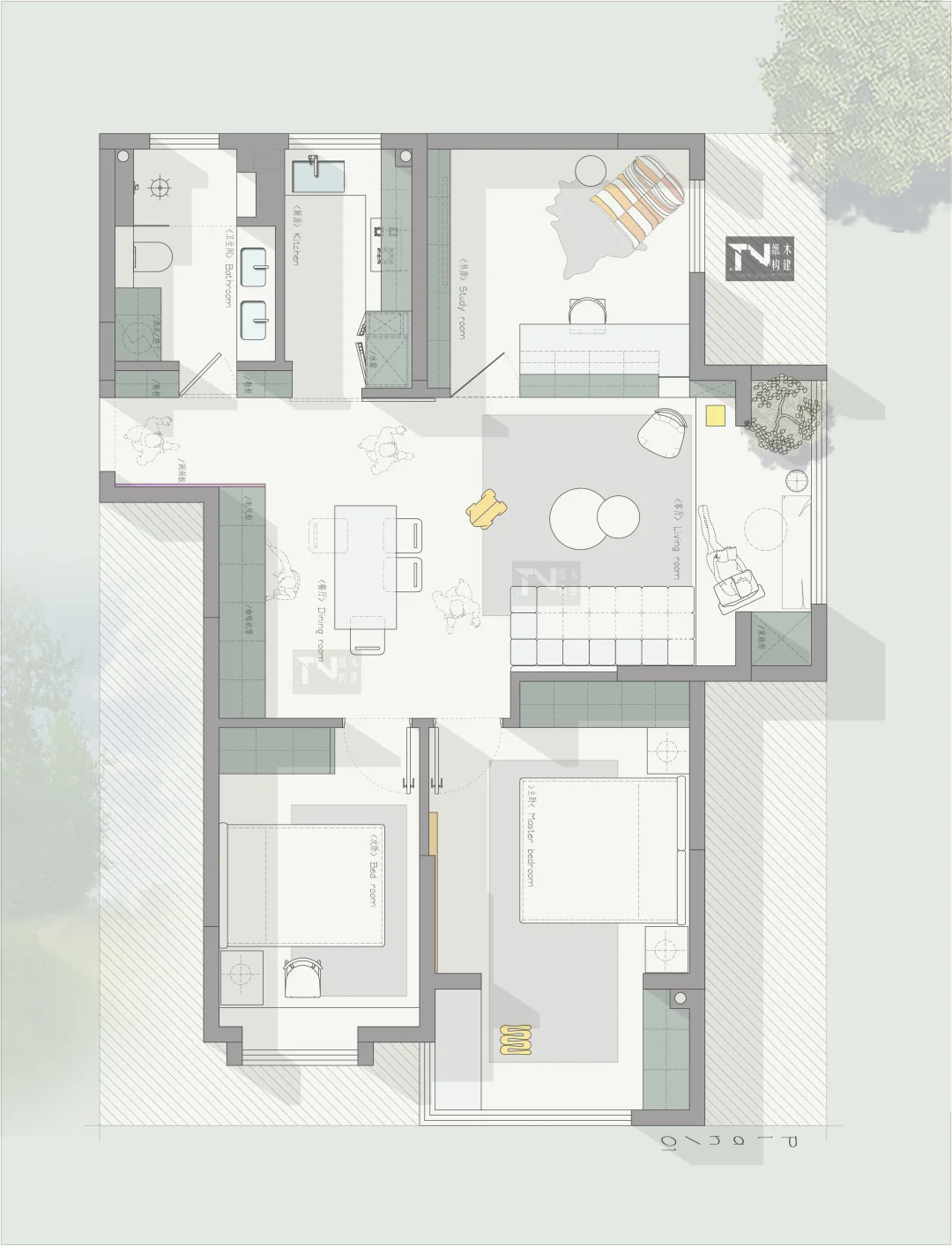 设计需求: 1、主卧,次卧,一个书房(一定要亮眼) 2、餐厅要一个餐边柜,咖啡机、直饮机 3、卫生间要双台盆 4、厨房可以小点 完美的户型,看看你怎么优化(委托原话)