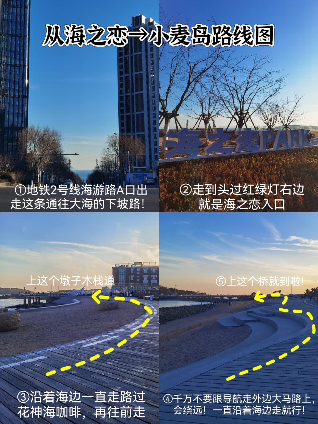❶地铁2号不要在麦岛站下!!1.2公里很远,小麦岛入口还在维修,还需绕到银海大世界迂回!听劝!坐到麦岛的下一站海游路A口出,出来就是通往大海的下坡路很省力,步行800米先去海之恋park!超出片!再沿着海边一路走到小麦岛~海景无敌!具体路线见图3~