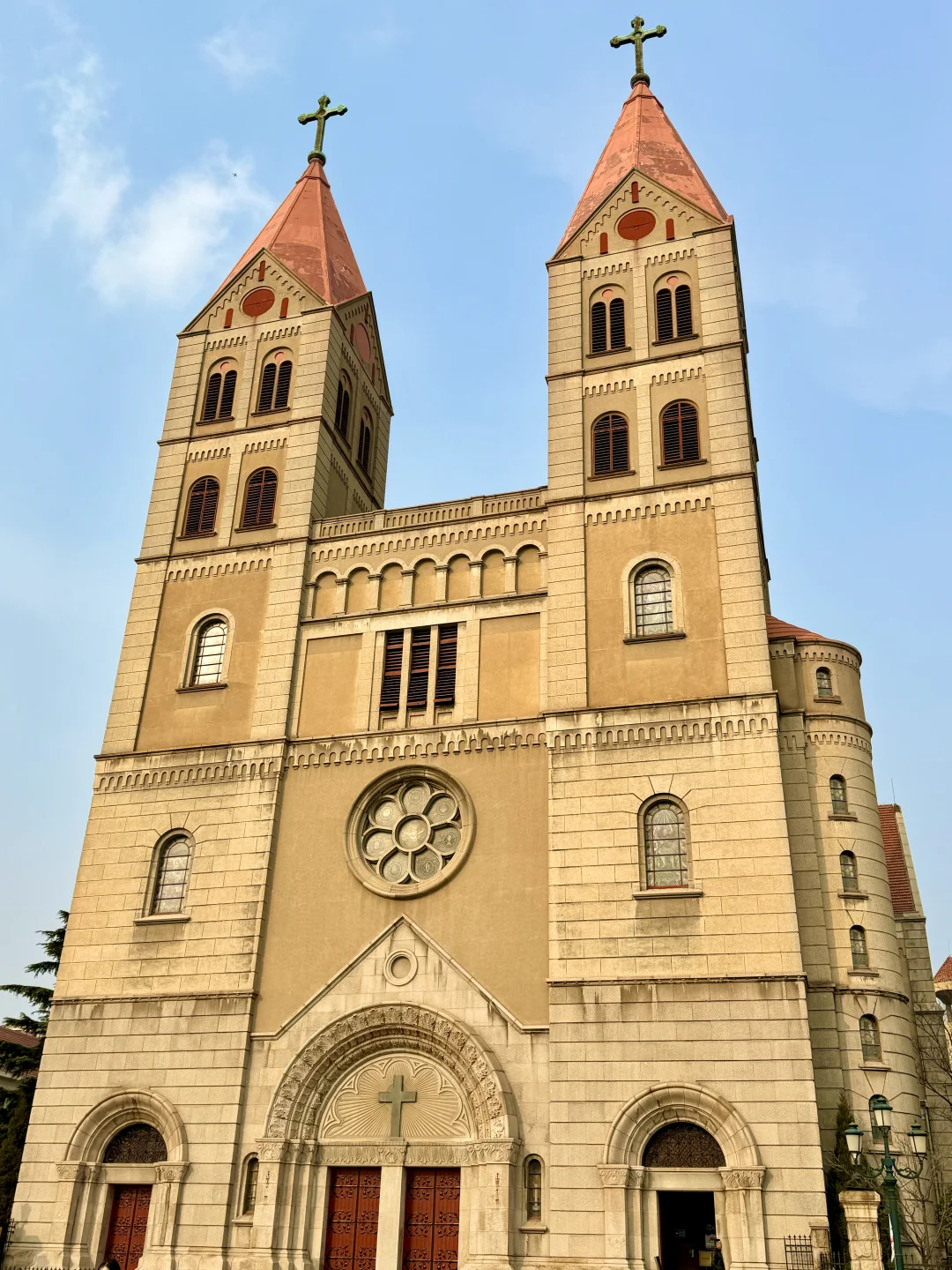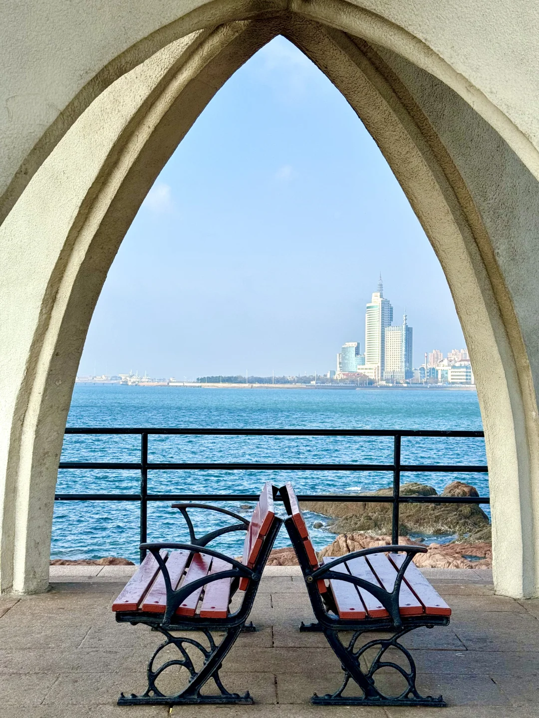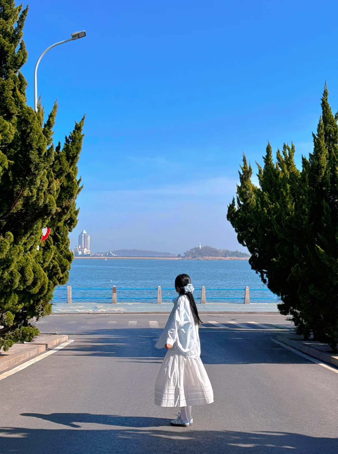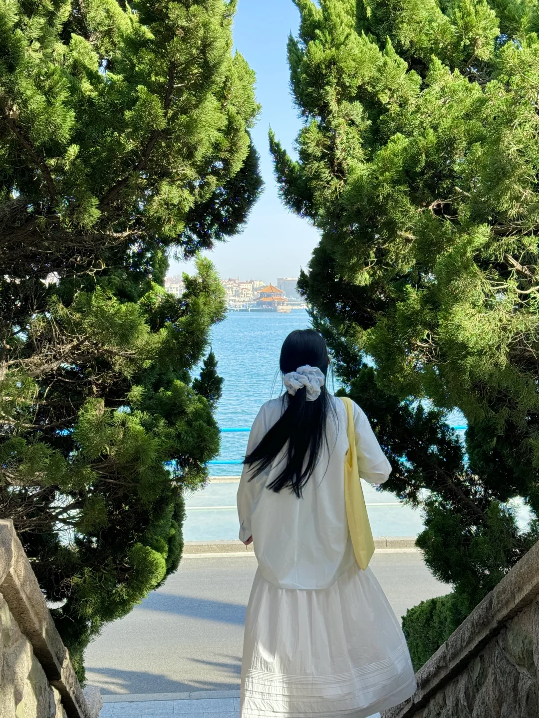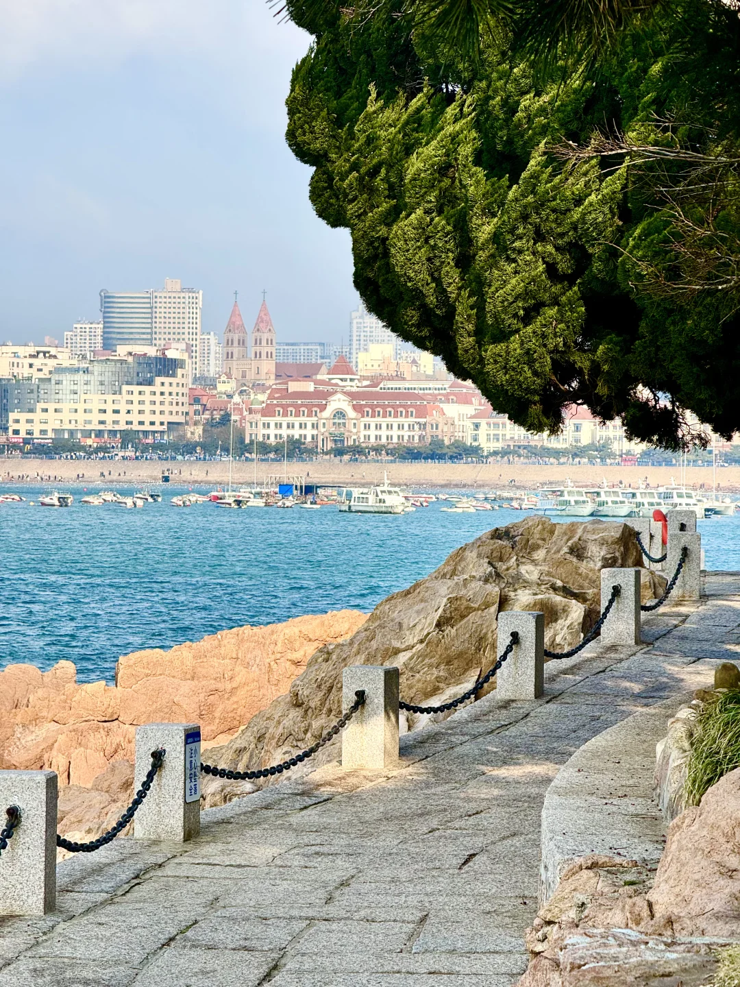 📍小青岛:坐等一场海上日落 海边的石子路也好拍 透过龙柏树拍栈桥和教堂 嘎嘎出片