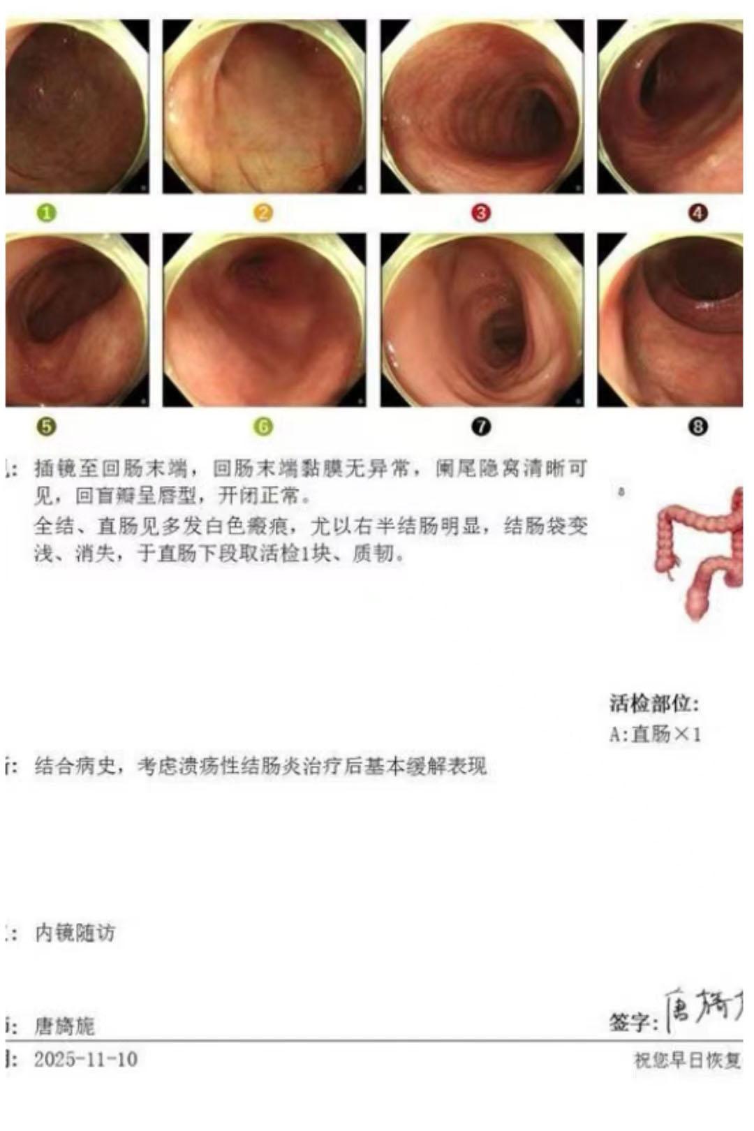 因为之前用过激素且疗效不佳,我重新制定了个体化治疗方案,包括调整药物种类、优化用药时机,并结合营养支持与生活方式干预。经过半年的系统治疗与密切随访,患者临床症状显著改善,复查肠镜提示黏膜愈合、炎症明显缓解。