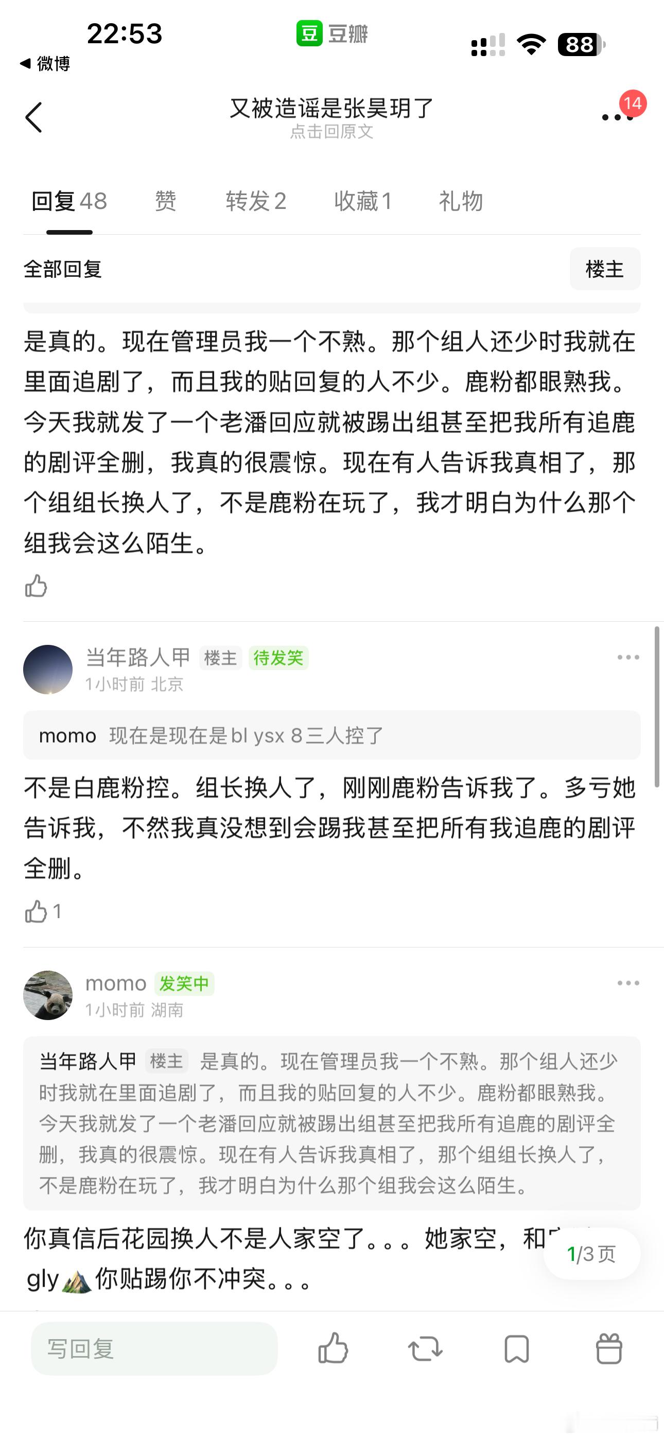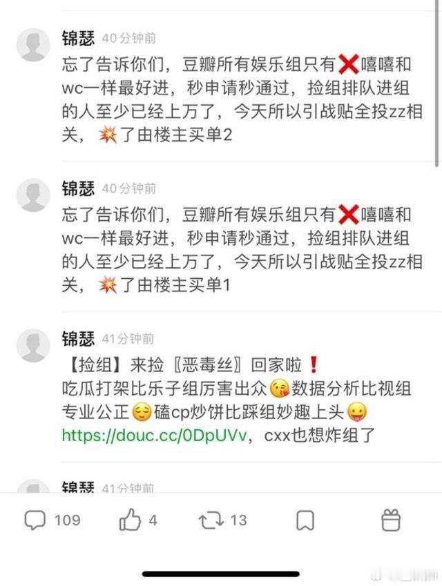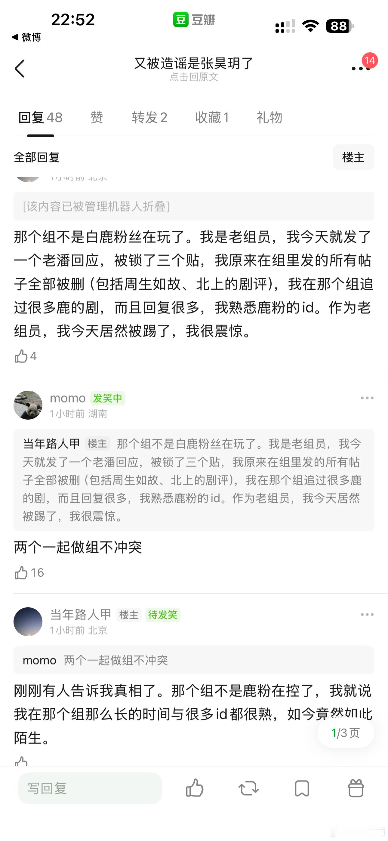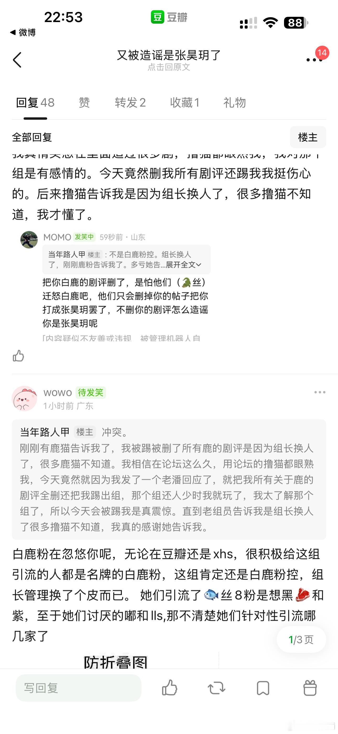 乐子组有一个路好白鹿的人说自己在捡组发了个老潘就被t出组了,之前发白鹿的剧贴也被删了,说很多鹿毛都眼熟他就算被踢也会拉回去,现在看管理员和组长都不认识了。之前都有白鹿粉在控现在不是了,鱼丝疑似侵入各处,买大粉号或者把管理员换成自己人,应该是预备搞舆论战。