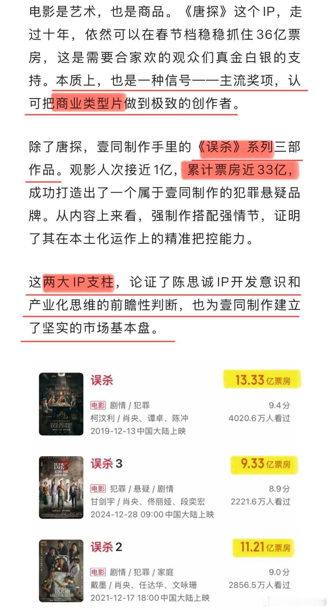 不得不说,陈思诚从2015年《唐人街探案》开始,在十年间已构建起了首个真正的国产电影IP,并累计斩获百亿票房。与此同时,他也一直在开拓电影《误杀》系列,促成本土电影IP的齐头并进,用实打实的作品,成功在悬疑类型的影片上扎根,更与壹同制作共同打造了成熟的商业类型片,陈思诚更像是一位孜孜不倦的电影工业化践行者,我们需要更多像陈思诚这样的导演,不断为电影市场注入活力与血液。
