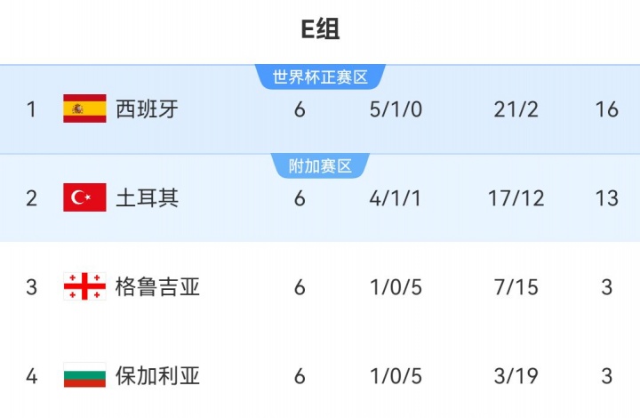 E组:西班牙头名直通正赛,土耳其第2将参加附加赛