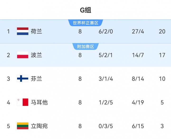 G组:荷兰头名直通正赛,波兰第2将参加附加赛