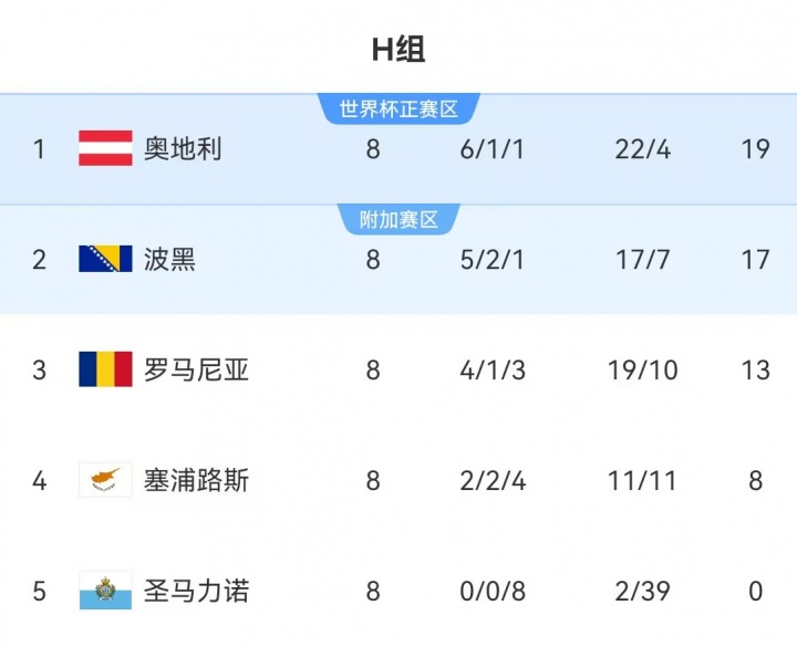 H组:奥地利头名直通正赛,波黑第2将参加附加赛,罗马尼亚凭借欧国联成绩进入附加赛