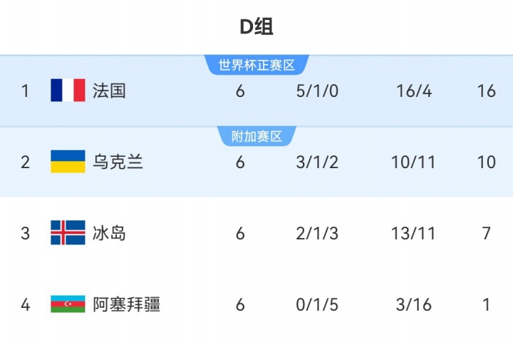 D组:法国头名直通正赛,乌克兰第2将参加附加赛