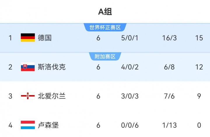 A组:德国头名直通正赛,斯洛伐克第2将参加附加赛,北爱尔兰凭借欧国联成绩进入附加赛