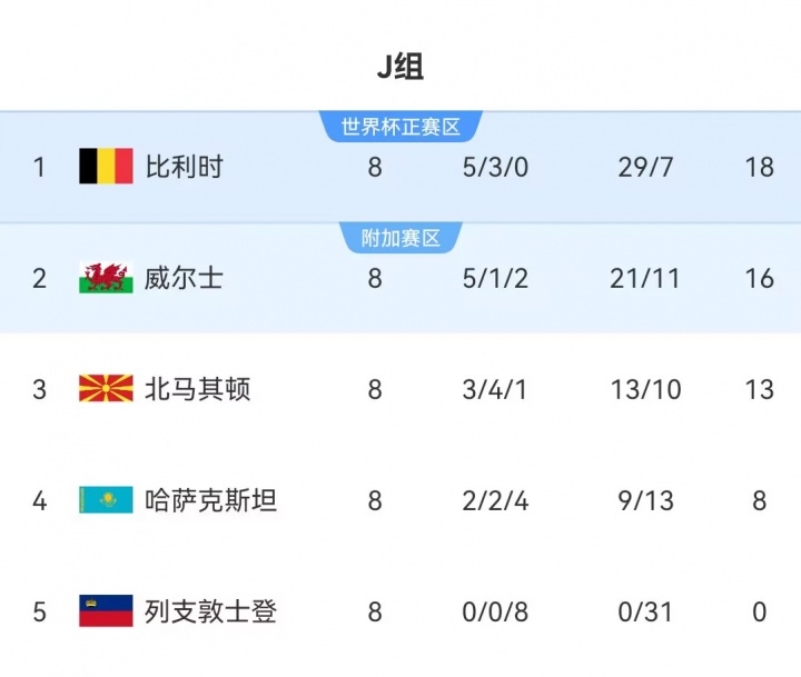 J组:比利时头名直通正赛,威尔士第2将参加附加赛,北马其顿凭借欧国联成绩进入附加赛