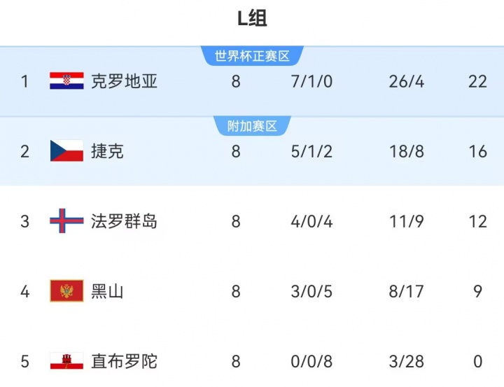 L组:克罗地亚头名直通正赛,捷克第2将参加附加赛