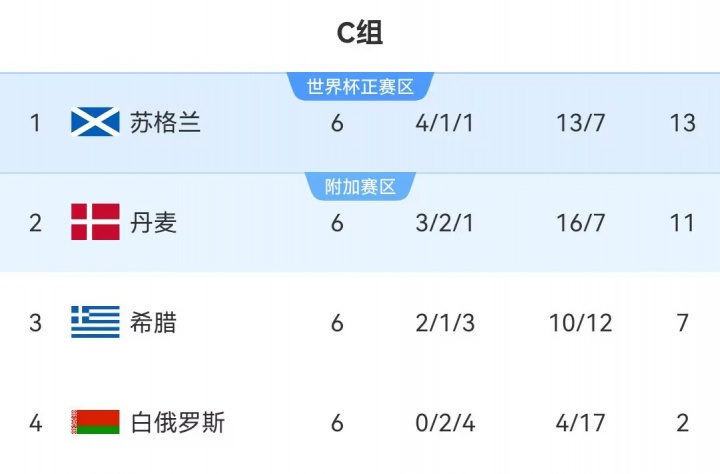 C组:苏格兰头名直通正赛,丹麦第2将参加附加赛