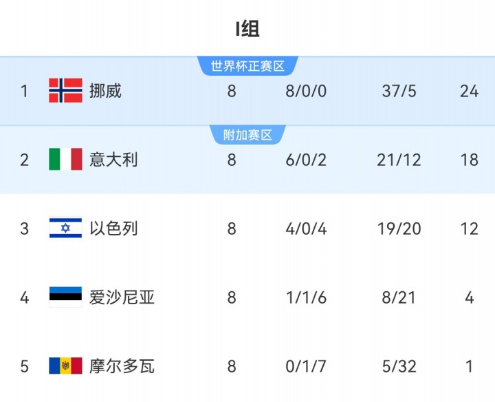 I组:挪威头名直通正赛,意大利第2将参加附加赛