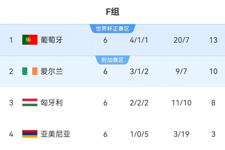 F组:葡萄牙头名直通正赛,爱尔兰第2将参加附加赛