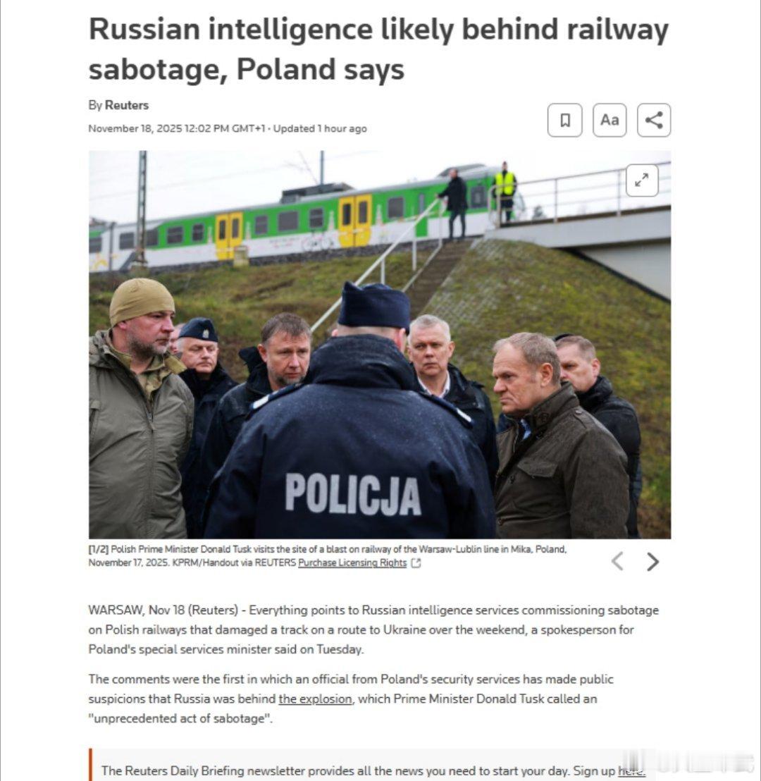 波兰公开指责俄罗斯情报部门对一条向乌克兰输送物资的关键铁路线实施了破坏。爆炸导致华沙至卢布林的铁路在米卡附近路段受损,波兰政府随即召开紧急国家安全会议。官员指出,所有证据均指向莫斯科参与此次事件,总理图斯克将其称为“史无前例的破坏行为”。图斯克在议会进一步证实,两名与俄罗斯情报部门长期关联的乌克兰籍人员具体实施了破坏行动。其中一人曾在利沃夫因破坏活动被判刑,另一人来自顿巴斯地区。两人均居住在白罗斯境内,并于今年秋季入境波兰。在至少一起成功的袭击中,肇事者使用了C4炸药。