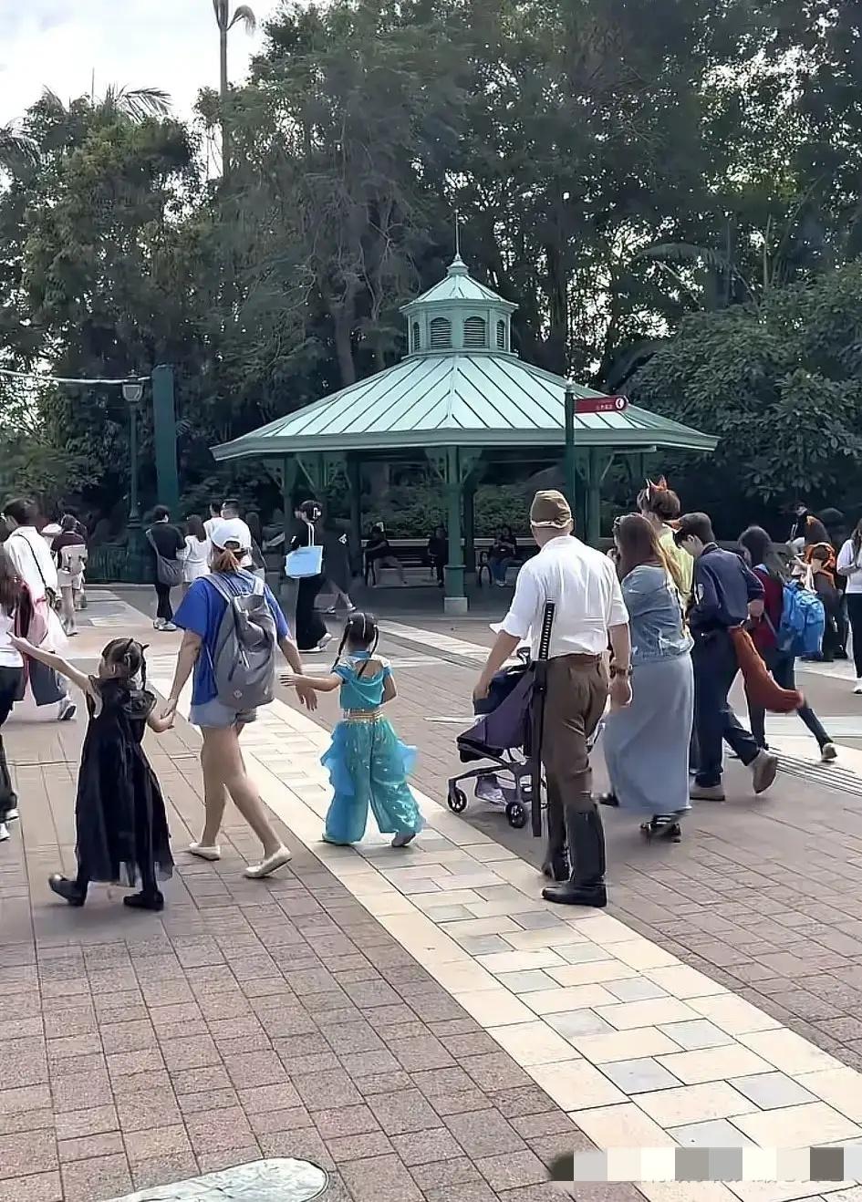 香港迪士尼乐园内,一名穿着鬼子衣服,且腰间束有佩刀的男子带着孩子跟妻子进入乐园。