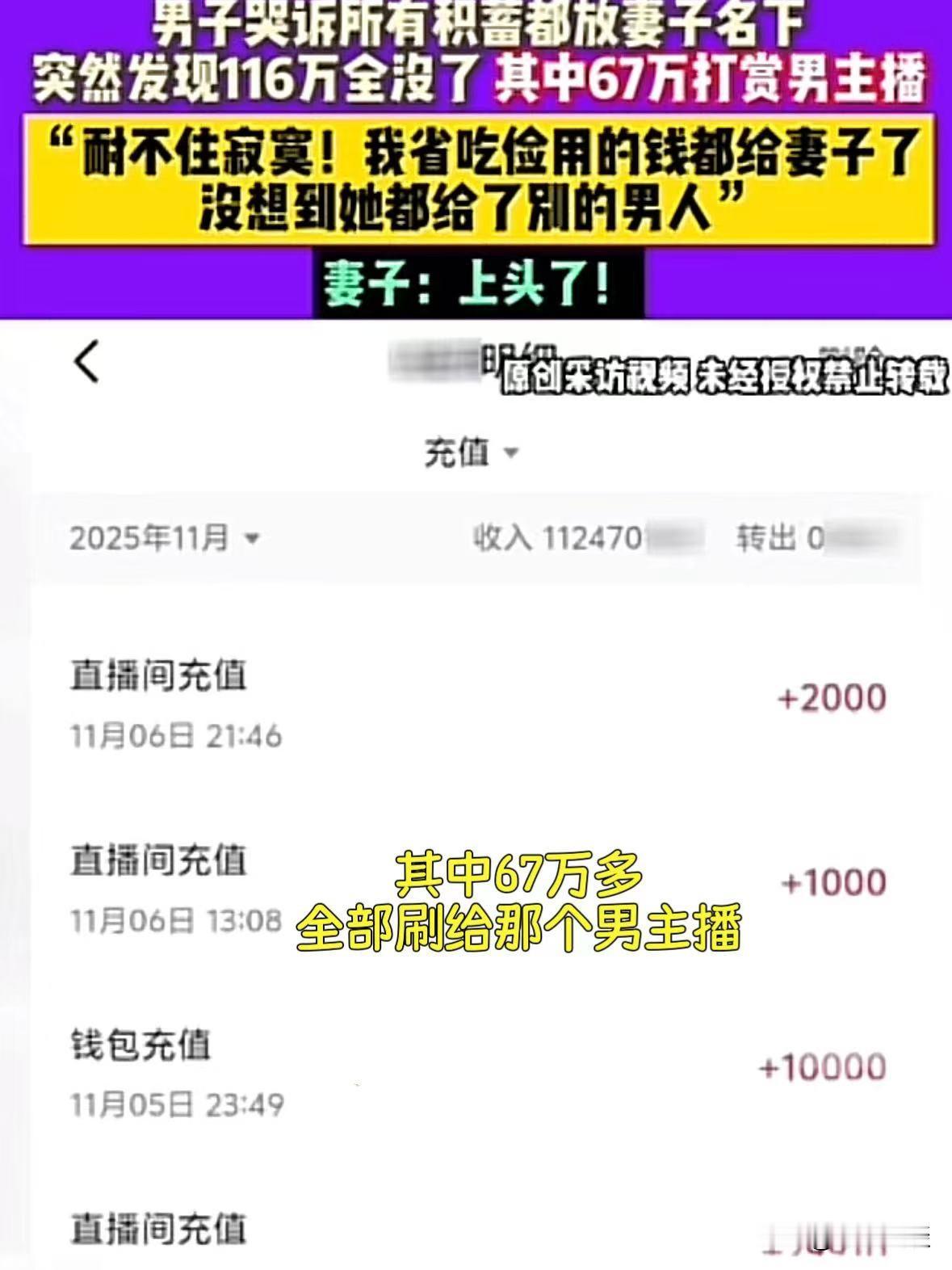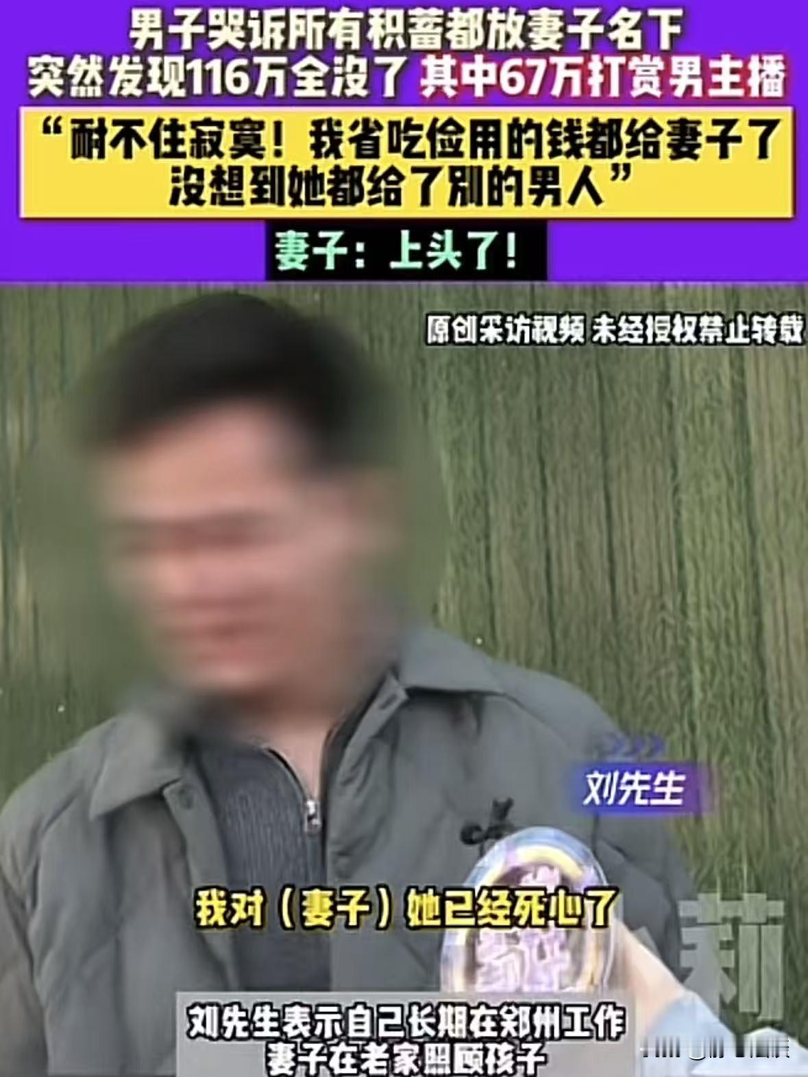 河南郑州,男子婚后和妻子两地分居,自己租300块一个月的房子,8年里,他省吃俭用存了116万积蓄,毫无私心的全部打给妻子,却万万没想到,守家待地的妻子耐不住寂寞,竟然偷偷将钱全部花光,其中67万全都给男主播打赏不说,最后还倒欠8万元的网贷,男子得知后气的崩溃,我全新全意对你好,所有的钱都给你,你竟然背刺我!妻子:花的时候上头了,后悔的时候已经晚了! 刘先生和妻子是经人介绍认识的,一来二去两人看对眼,很快就结了婚。 刚结婚的时候两人甜的像蜜,后来因为有了孩子,生活开销越来越大。 刘先生为了多赚点钱,跑到郑州工地上干苦力,这活虽然辛苦,但是他有手艺,赚的还算可以。 而妻子因为双方父母都年龄大了,则留在老家照顾老人和孩子。 就这么着,两人分居的日子一开始便是8 年。 8年里,刘先生省吃俭用,住300块钱一个月的房子,冬天漏风夏天漏雨。 吃东西也是能吃饱就行,从来不挑,然后每个月把剩下来的钱一分不剩的全打到妻子的卡上。 刘先生不管自己多苦,从来不说,他觉得男人就要有担当,只要媳妇孩子父母过得好,比啥都强。 后来经过自己多年的努力,两口子攒了不少钱,其中有116万还被妻子存了定期。 前段时间,刘先生回家想和妻子商量下用这笔钱在郑州买一套房。 把父母都接来,这样一家人就不用离得那么远,过的那么辛苦。 谁知妻子听完后支支吾吾的不同意,刘先生觉得奇怪,再三追问下,妻子说了实话,钱没了! 钱没了?怎么能没呢?不是在银行卡里存了定期! 刘先生心里咯噔一下,妻子眼见瞒不住了,眼泪刷刷的流。 她告诉丈夫,钱没了,现在还欠8万网贷!刘先生一下没站稳,差点躺那。 刘先生声音颤抖地问妻子,那不是1万6,是116万,怎么会没呢,你不是说都存着呢吗?你快说你到底干啥了? 在刘丈夫的逼问下,妻子才断断续续地说出了实情。 原来,刘先生不在家的这几年,妻子一开始还挺安分,在家照顾老人,没事的时候就看看手机。 后来刷短视频,关注了一个男主播,那主播长得帅气,嘴也甜,一口一个宝宝叫着,把她哄得晕头转向。 一开始,她也就是偶尔给主播刷个几块钱、几十块钱的小礼物,觉得就是图个乐呵。 可那主播很会来事,知道刘先生妻子是铁粉,就经常在直播里感谢她,还私下给她发消息。 一口一句姐姐你真好,宝宝你真懂我,我爱死你了……妻子被这些甜言蜜语冲昏了头脑,觉得自己找到了知己,越来越上头。 她开始不断地给主播刷礼物,从几十块到几百块,再到几千块、几万块,根本控制不住自己。 最后打赏男主播的钱高达67万,剩下的钱,有的被她用来买了奢侈品,有的被她挥霍在了其他地方。 反正到最后,116 万全花光了,她还觉得不过瘾,又偷偷借了 8 万的网贷。 刘先生听着妻子的话,气得浑身发抖,嘴唇哆嗦着,说不出一句话。 他看着眼前这个自己爱了八年、疼了八年、毫无保留信任的女人,觉得无比陌生。 他想起自己在工地上搬砖扛水泥的日子,想起自己在 300 块钱的出租屋里吃咸菜煮面条的日子。 那些日子虽然苦,但他一想到自己的钱能让媳妇孩子过上好日子,能早日拥有一个属于自己的家,就觉得浑身是劲。 刘先生声音哽咽着,眼泪止不住的掉,他说我把所有的钱都给你,我对你毫无保留,你竟然这么背叛我!你怎么忍心啊! 最后越说越激动,最后直接崩溃了,他蹲在地上,双手抱着头,哭得像个孩子。 这些年所有的委屈、辛苦、期盼,在这一刻全都化为了泡影,被现实狠狠打了一记耳光。 而妻子面对丈夫的质问,除了一个劲的哭就是一个劲的道歉,说自己知道错了。 冷静下来后,刘先生认为妻子大额打赏属于夫妻共同财产。 便将此事反映给直播平台,客服表示需要上传资料再进行确认。 后来他找到记者,想让他们帮忙,面对镜头,八尺男儿的刘先生哭的让人心疼。 他表示自己对妻子已经彻底死心,我全新全意的对她,她反过来被刺我,不会在原谅她。 现在唯一的诉求就是看看是否能把打赏的钱追回来。 《民典法》第1062条:夫妻在婚姻关系存续期间所得的下列财产,为夫妻的共同财产,归夫妻共同所有:(一)工资、奖金、劳务报酬;(二)生产、经营、投资的收益;……夫妻对共同财产,有平等的处理权。 刘先生的收入属于工资、劳务报酬范畴,且产生于婚姻存续期间,毫无疑问是夫妻共同财产。 夫妻对这笔钱的处理权是“平等”的,不是一方单独说了算,任何一方处置大额共同财产,都必须征得另一方同意。 至于妻子网贷的8万块钱,刘先生并不知情,并且不是用于家庭支出。 因此刘先生有理由不承担还款责任,由妻子独立偿还。 对此,你怎么看待这件事呢? @静心法谈 学法辨是非,慬法不吃亏。