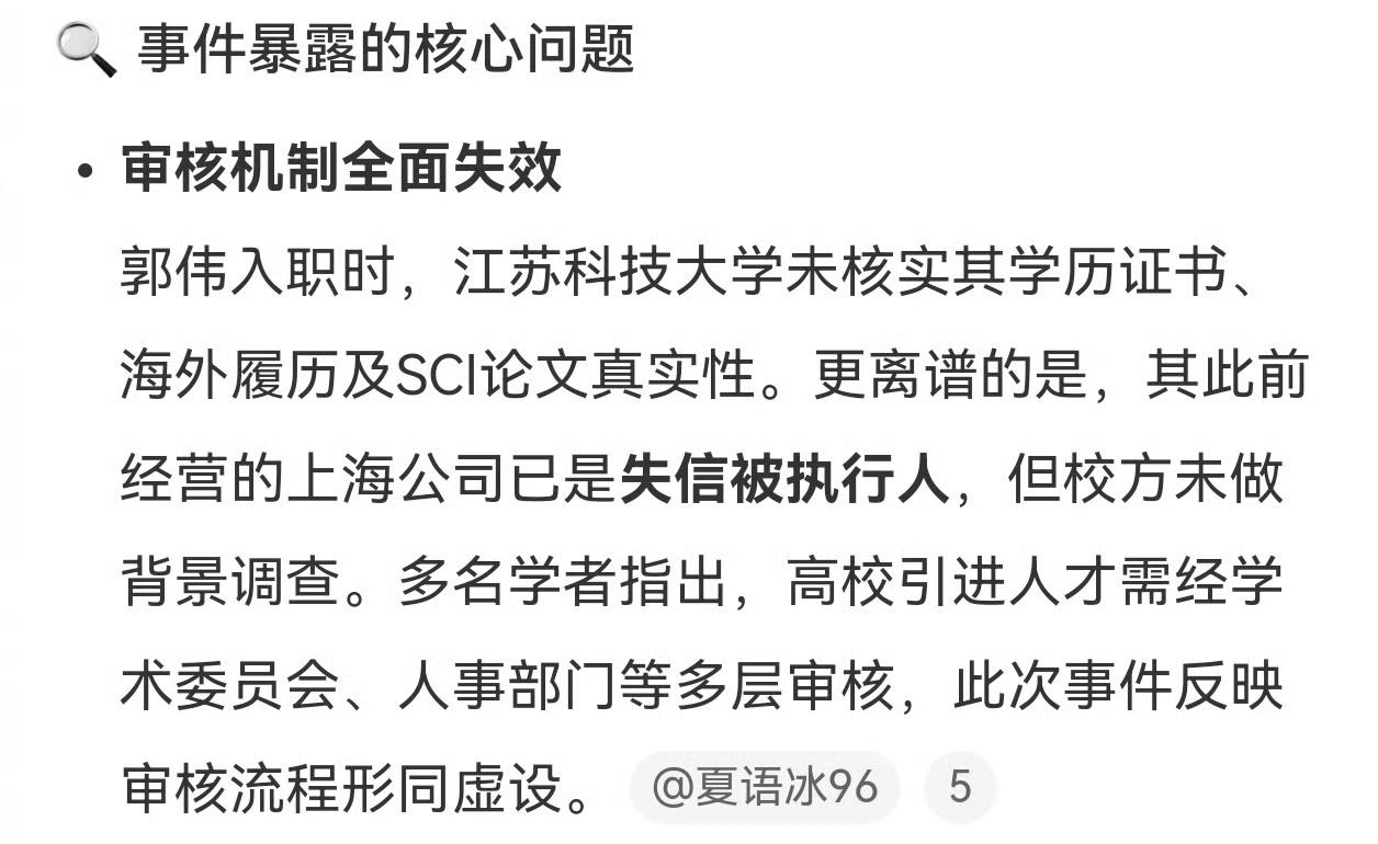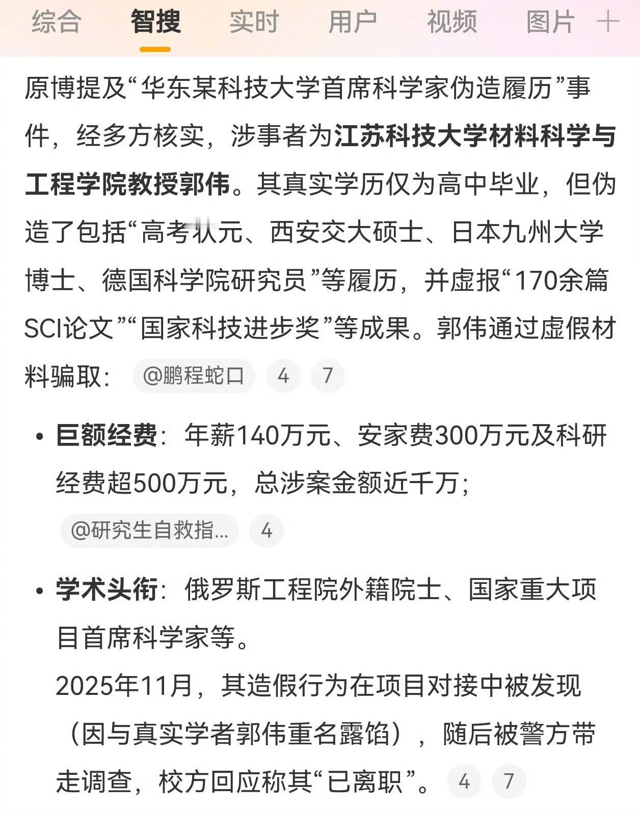 太荒唐了,首席科学家被爆只有高中学历,院士头衔造假30年,简历全靠编! 只有高中文化程度的郭伟,拿同名同姓的人的履历、论文冒充纳米材料研究专家,2023年被聘为江苏科技大学首席科学家、二级教授,招了博士生,发表170多篇sci,骗取上千万元经费,今年要参选院士,才东窗事发,才被抓了。 可以说这样的骗术不高级。但是又恰好不容易考证。90年代的高考状元,没有准确的记录,90年代的海外入学经历,也没有学信网供查询,简历里涉及的学院导师有都是真实存在的,并不容易被识破。 尽管不高级,但只要第一步做成了,后续的步步高顺理成章。他可以凭借这个骗术包装拿到项目,获得生源,再将其他团队成员的学术成果转为己用,之后的成果都是真的,很难会有人质疑。 根据网上的报道,他确实入职前的经历也在材料方向从事。材料学有个外号是炼丹学,顾名思义,实践经验很重要,运气很重要,或许这是他最初成功的关键但也是他后来被人识破的关键。 学术造假必须零容忍!支持高校坚决维权,就是可怜了被他带过的学生,本来好好的学历目前还不知道会不会失效。