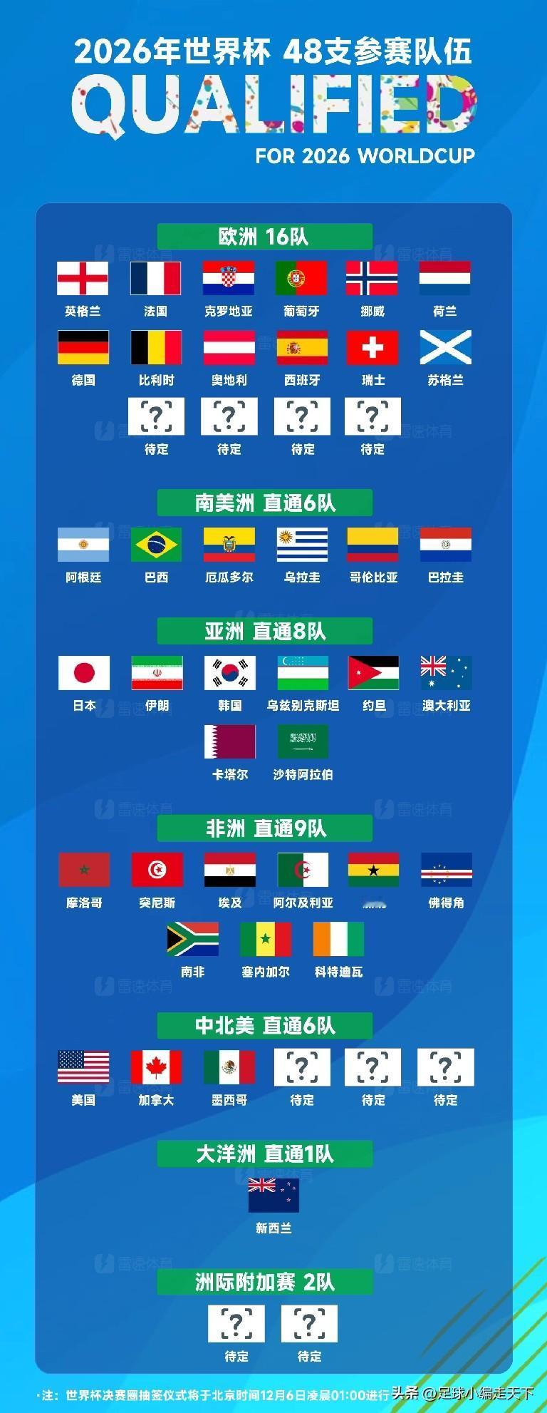 世界杯48强已定39席!感觉这名额分配极不合理,大洋洲,亚洲,北美洲名额过多,弱队多影响比赛质量,应该欧洲多几个名额,欧洲无弱旅。 建议国际足联下届多给欧洲几个名额吧,亚洲和非洲根本就不配拥有这么多的名额,非洲和亚洲各让出2-4个名额给欧洲吧。 就目前欧洲附加赛的前三档球队都是妥妥世界杯决赛圈实力。第四档的球队也能秒杀约旦和乌鸡。欧洲区应该至少给20个才合理。 而咱们中国队在亚洲想出线就不要想了,去大洋洲都不一定能稳出线。所以应该申请加入南极洲足联,和企鹅踢包出线的。[偷笑]