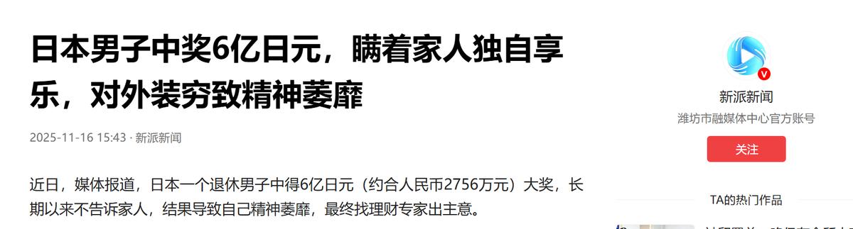 乐极生悲了吧?日本一男子买彩票,中了6亿日元,为了独自享乐,竟然没有将此事告诉家人,对外仍然装穷,结果导致自己精神萎靡,然而,他不去找医生,反而找理财专家出主意,听了专家建议,他把剩余的钱,全部投入了保险中! 乐极生悲这事儿,还真在现实里上演了,日本有位 66 岁的 S 先生,本来日子过得挺安稳,他和妻子每月有 30 万日元退休金,手里还有五千多万日元积蓄,虽说不算大富大贵,但节俭点花,安安稳稳养老完全没问题。 可谁能想到,一张彩票彻底打乱了他的生活,他中了 6 亿日元的头奖,这笔从天而降的横财,没给他带来幸福,反倒让他陷入了无尽的烦恼,最后落得个精神萎靡的下场。 中了这么大一笔钱,换谁都会激动,可 S 先生心里的小算盘打得精,他不想把这笔钱告诉家人,就想自己偷偷享乐。,于是他编了个谎话跟妻子说自己只中了 500 万日元。 为了让这个谎言看起来天衣无缝,他还特意用这 500 万 “奖金” 把家里的老房子翻新了一遍,妻子压根没怀疑,还一个劲夸他运气好花钱又实在,殊不知丈夫心里藏着一个天大的秘密,这句称赞听在 S 先生耳里,别提多讽刺了。 从那以后S 先生就过上了 “两面人” 的生活,在外人面前,他还是那个节俭持家的普通老人,和妻子出门依旧精打细算,可一旦独自一人,他就彻底放开了手脚,开始疯狂挥霍那笔隐藏的巨款。 短短半年时间,他就悄悄花掉了 1800 万日元,以前想都不敢想的高级餐厅,他成了常客顿顿山珍海味,名牌手表、奢侈品,只要看上眼就毫不犹豫买下,尽情享受着从未有过的奢华生活。 可这种独自享乐的日子,并没有给 S 先生带来真正的快乐,相反随着花钱越来越多,他的心里越来越不是滋味,在高级餐厅里独自用餐,面对满桌佳肴,他尝不出丝毫美味,只觉得心里空落落的,孤独感像潮水一样涌来,买的名贵手表,怕被妻子发现,每次进家门前都得匆匆摘下来藏好,仿佛那是什么见不得人的东西。 这笔 6 亿日元的横财,慢慢变成了困住他的枷锁。他以为有了钱就能自由,却没想到反而被钱牢牢捆住,因为要守住秘密,他变得越来越焦虑,晚上翻来覆去睡不着觉,白天精神萎靡,做什么都提不起劲。 他开始刻意回避妻子,在家话越来越少,以前夫妻俩饭后还会聊聊天、散散步,现在他总找借口独处,家里的氛围变得越来越冷清。 他明明坐拥亿万财富,却活得像个囚徒,被自己编造的谎言和巨额财富压得喘不过气,这种奇怪的状态,其实是典型的 “突得财富症候群”,突然拥有远超预期的财富,又不知道该如何面对和处理,最终陷入精神困境。 可 S 先生没想着去找心理医生疏导,反倒觉得是自己不会管钱才出了问题,于是他找到了理财专家,想让对方给点主意。 理财专家听完他的情况,很快就找准了问题的关键,不是钱太多而是他把钱当成了私人专属,还被秘密困住了,专家给了个干脆利落的建议:,把剩余的钱全部投入巨额寿险,而且要把保单的受益人写成家人的名字。,这个建议看似是理财规划,其实是帮他解开了心里的结。 S 先生听从了专家的建议,立马办理了相关手续,当他把受益人填成妻子和家人的那一刻,心里的重担仿佛一下子卸了下来。这笔曾经让他独自挥霍、备受煎熬的巨款,不再是他的私人秘密,也不再是让他焦虑的根源,而是变成了守护家庭的保障。 虽然他之前隐瞒中奖的行为,给夫妻间的信任留下了裂痕,不可能一下子修复,但至少这笔钱不会再让他陷入疯狂和痛苦,以前他把钱攥在自己手里,只想着独自享乐,结果被钱异化,活得不像自己,现在把钱变成给家人的保障,钱的意义变了他的心态也跟着变了。 回过头看,6 亿日元本身没什么错,错的是 S 先生一开始的心态,他以为独自占有财富就能获得快乐,却忘了幸福从来不是独自享乐,而是和家人共享的安稳。 这笔横财让他乐极生悲也让他最终明白,财富的意义不在于挥霍,而在于责任和守护,当他把钱的舵盘交还给家庭,不再执着于独自占有,反而从财富的囚笼里解脱了出来。 (信息来源:新派新闻——日本男子中奖6亿日元,瞒着家人独自享乐,对外装穷致精神萎靡)