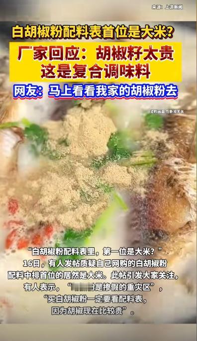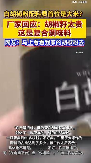 “离谱!”江苏南京,一男子网购了一瓶白胡椒粉,可收到货还没等打开,看了一眼配料表才发现,白胡椒粉配料中排首位的居然是大米,商家回应:纯的白胡椒粉太贵了,没人买! 杨先生(化名)最近看到家里面炒菜要用的胡椒粉要用完了,于是他就在网上购买了一瓶,然而就在等快递到他拿起看配料的时候,却发现配料占比比较大的是大米而非胡椒。 “离谱” 这是他第一反应,杨先生常年做饭,对调味品成分本来就多留意些,常买调料的人都知道,配料表第一位意味着含量最高,现在白胡椒粉排在后面,跟大家对 “白胡椒粉” 这名字的期待完全对不上。 他赶紧找商家问情况,商家倒是没绕弯子,直接说了实话,纯白胡椒原料价太高,要是只卖纯的,一瓶零售价得六十多才能回本,可这价格市场接受度低,销量根本没法保证。 所以才在配方里加了大米之类的填充物,就是为了降成本,末了商家还说,要是不满意,能申请退款。 这事被杨先生放到网上后,网友们吵翻了天,有人觉得商家不地道,打着 “白胡椒粉” 的名义,实际掺了低价原料,这不是误导消费者,也有人说,包装上明明白白写了配料,没违规,消费者买的时候自己该多看看成分表。 还有人提到监管层面,要是商品名称和主要成分对不上,可能违反了《标准商品名称》和食品标签的相关规定,平台和监管部门得加强审查才行。 其实光生气解决不了问题,消费者买东西,最基本的就是有权知道自己买的到底是什么,配料表得清晰、真实,要是配方比例让 “白胡椒” 不再是主要成分,那商品名字就该改改,得反映实际情况才行。 再说电商平台和市场监管部门,对商品的标注、宣传也得把好关,别让这种 “名不符实” 的促销行为,误导了大家。 对咱们消费者来说,下单前也得多留个心眼,看看成分、产地,翻翻其他买家的评价,遇到有疑问的地方,及时把凭证保存好,要是真出了问题,也好通过平台或者监管渠道维权。 通过这事其实也给大家提了个醒,商品标签不只是商家自己说说,更关系到咱们消费者的选择权和对商家的信任,一行简单的配料表,背后能看出商家的诚信和监管是否到位。 一瓶小小的香料,说到底,考验的是市场对透明和公正的接受程度。 对此,你还有什么看法呢? (信息来源 :江苏经济报 )