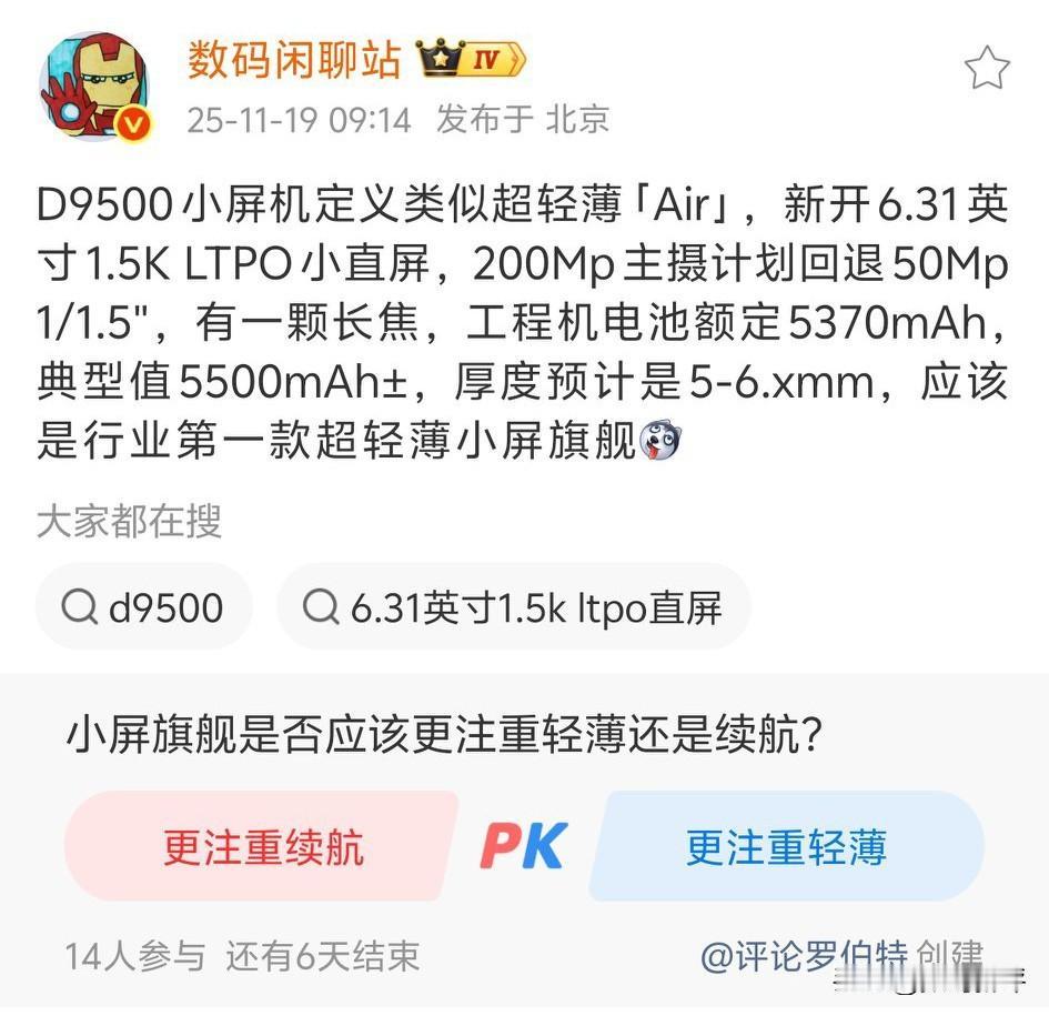 荣耀的小屏机定位air取向[我想静静]电池容量5500毫安左右,因为要把厚度控制在5-6mm,原计划的两亿像素主摄可能换成常规1/1.56英寸主摄,荣耀想搞air小屏旗舰,感觉小屏旗舰堆大电池好一点啊,air机型的市场太小了,而且荣耀堆超大电池还是很激进的[思考]