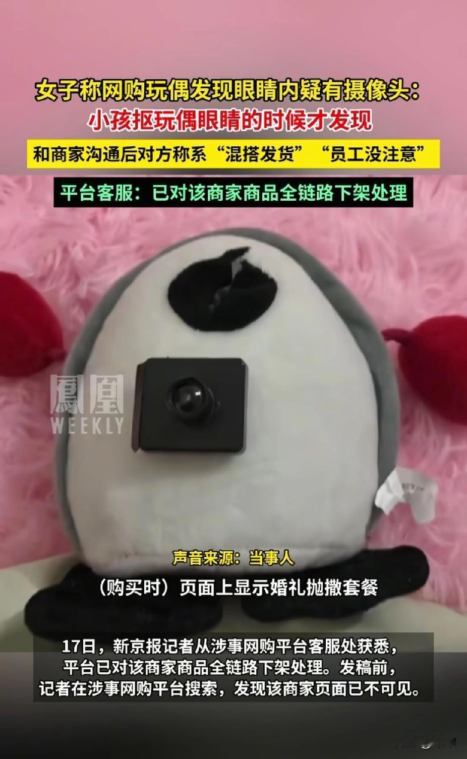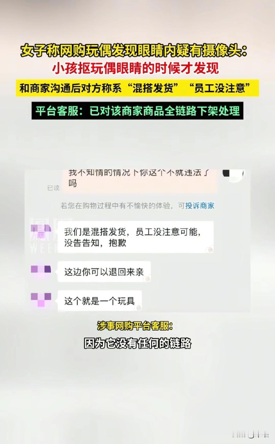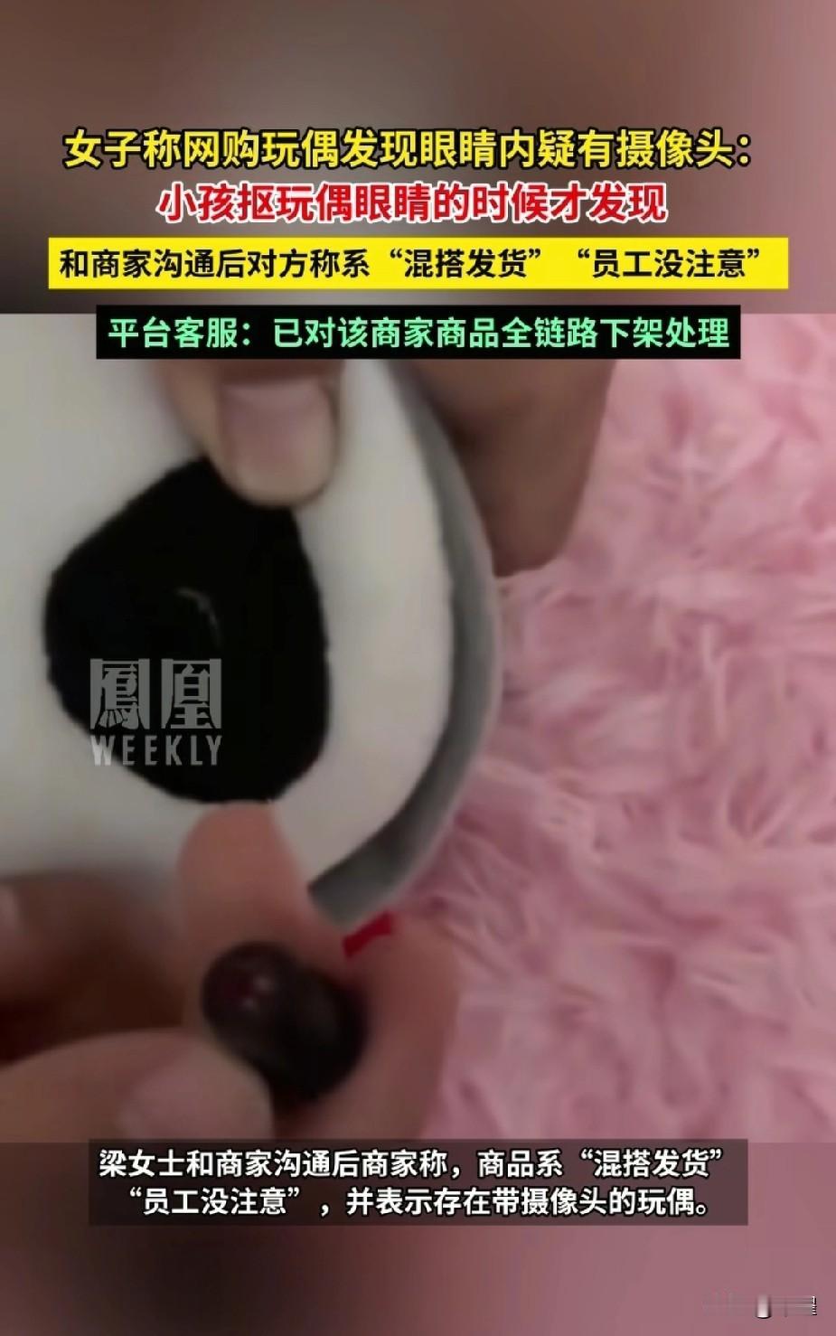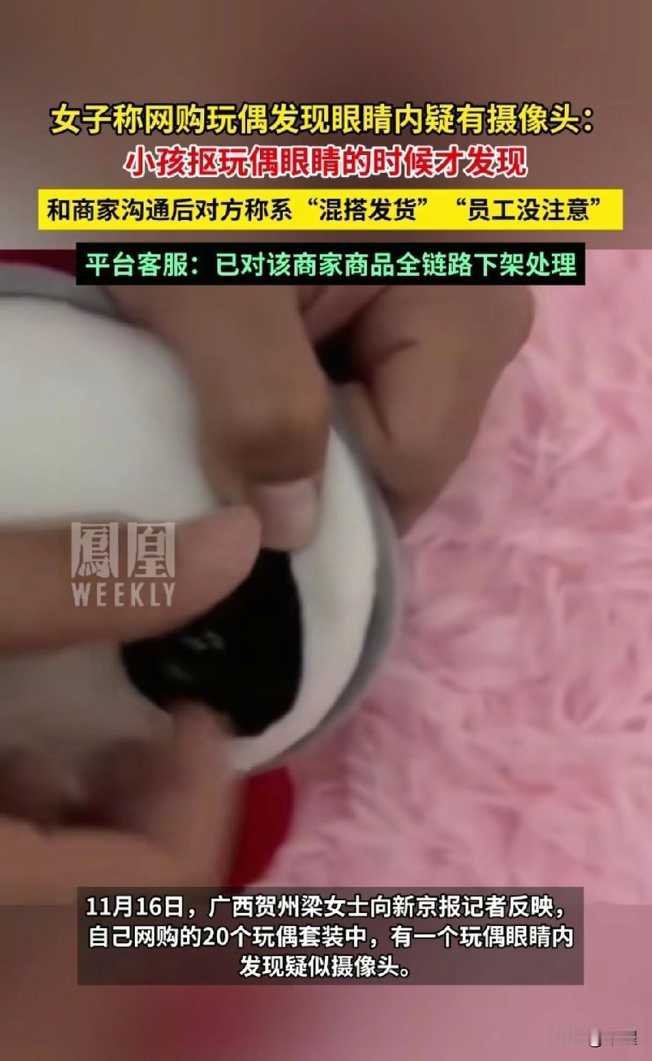 网购的毛绒玩具里 竟然藏着这个东西 细思极恐啊 网购的20个玩偶套装中,小孩子抠玩玩偶眼睛的时候,才发现有一个眼睛里有摄像头。 沟通商家客服,说是“混搭发货”“员工没在意”。 平台客服称,已经对该商家的商品进行下架处理。 有人说,没有电路,没有储存设备,也没有联网,没有意义。 就算没有作用,下单之前,客服也该提前告知,否则存在欺骗行为。 没有处罚,没有追责,只是下架,该谨慎网购了 网购玩具 萌娃毛绒 小玩意毛绒 网购玩偶 毛绒创意玩偶 毛绒玩偶礼盒 毛绒玩具电商 玩偶收纳玩具