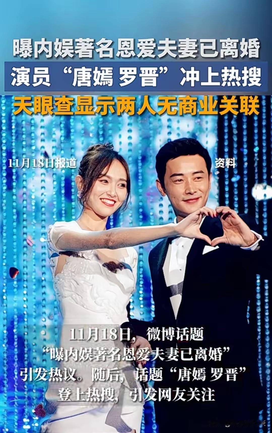 听说唐嫣罗晋离婚了?理由笑死人。 居然有人查了天眼查,发现俩人没商业关联,就盖章他们感情破裂。哎哟喂,现在App比民政局还权威了。 我特意去看了爆料,说他们长期分居零互动。可前两天罗晋还状态挺好地参加活动呢。人家夫妻低调过日子,非得天天秀才算恩爱吗。 我表姐结婚十年也没和姐夫开共同公司,难道他俩是假夫妻?真逗。 现在有些人啊,盯着明星夫妻就像盯股票,涨跌都要分析。感情非得绑在股权书上才算数? 过日子如人饮水,冷暖自知。你们身边有这种硬按头离婚的戏精吗。