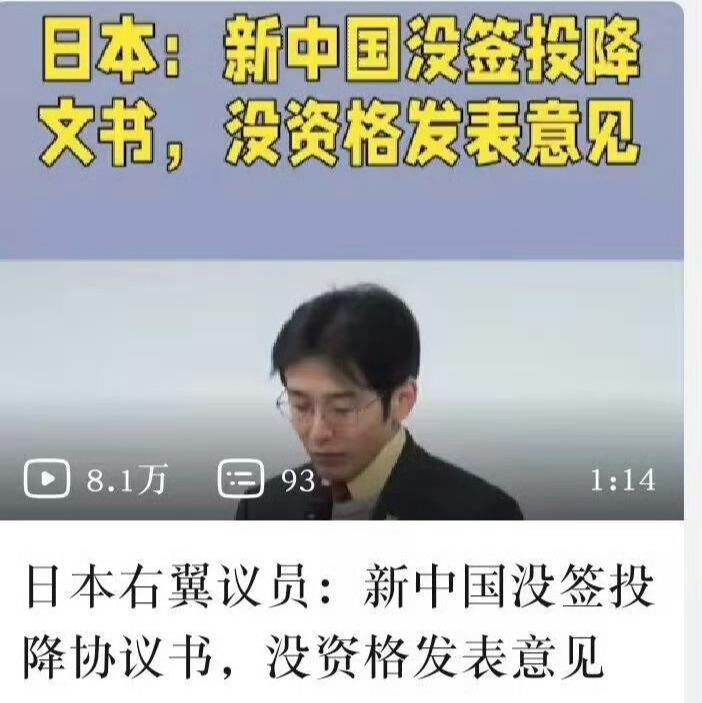 日本右翼议员:新中国没签投降协议书,没资格发表意见!   很多日本右翼分子并非真心反思战争,他们只是“反战败”,他们企图通过割裂历史、玩弄文字游戏的方式,来挑战二战后建立的国际秩序。   他们抛出“新中国未签投降书”这个说法,本质上是为了否定中华人民共和国对中华民国法统的继承,进而动摇我们对台湾拥有主权的法理根基。   二战后关于日本问题的法律框架,是一系列具有国际法效力的文件共同构成的,而不是仅仅依靠一份《日本投降书》。   日本投降,就意味着它在法律上已经接受了将台湾归还中国的规定,这是对当时全体同盟国的集体承诺,包括作为主要战胜国之一的中国。   无论后来中国国内政权如何更迭,都改变不了“中国”作为战胜国和主权国家的身份。   中华人民共和国在国际法上全面继承了中国作为二战战胜国的权利和地位,这其中当然包括了对台湾的主权。   日本右翼议员故意混淆“中华民国”与“中华人民共和国”,试图用政权更迭来否定国家主权的延续性,这在法理上是极其荒谬和无知的。   如果说因为新中国没有在1945年的投降书上签字,就意味着这份文件对我们没有约束力,那么,这份文件的另一方——日本,是不是也就不算向我们投降了?   如果战争状态没有结束,那所谓的“中日友好”又是建立在什么基础之上?甚至,联合国宪章中至今保留的“敌国条款”,原本就是针对德、日等二战轴心国的。   这些条款为战胜国在特定情况下,为维护世界和平与安全,对曾经的敌国采取行动提供了法理依据。   如果日本执意要挑战战后秩序,否定其投降的法律后果,那是不是在提醒全世界,这些为了防止军国主义复燃而设立的条款,依然具有现实意义?   从高市早苗叫嚣“台海有事”可能构成日本的“存亡危机事态”,到日本右翼议员否定新中国的合法地位,其最终目的就是为日本的军事正常化和干涉他国内政寻找借口。   今天,日本右翼的挑衅,恰恰提醒我们,维护二战胜利成果的重要性,我们不仅要记住历史,更要懂得运用法律武器,捍卫国家的主权与尊严。   个人观点,仅供参考!