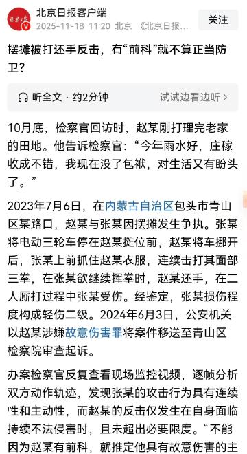 内蒙古包头,刑满释放人员赵某摆摊时和张某发生争执,张某抓住赵某的衣领打了他三拳,欲再打时赵某还手致其受了伤,案发后民警认为赵某涉嫌故意伤害罪,将他移交给了检方审查起诉。赵某不服:难道就因为我有前科,就不算正当防卫了吗? 事情的起因是在2023年的时候,赵某(化名)因为之前犯了一点小事情,刚出来,出来之后他觉得有了案底之后也没人敢录用他,于是就直接买了一辆三轮车,开始了摆摊生意。 可令他意想不到是在他摆摊的时候莫名其妙的出来了一名男子,张某(化名)却故意将车辆挡在了他的前面,影响做生意,最后还做出了故意挑衅,就这样两发生了冲突。 最后民警介入调查之后,觉得他的行为已经构成了故意伤害,就将赵某移交到了检察院进行进一步的审理。 可赵某却不认这个定性,他说自己是被打了才还手的,是正当防卫,这事儿要是搁以前,可能有人会因为赵某有前科就先入为主觉得是他的错,但这次检方没这么做。 先说说当时到底发生了啥,监控拍得清清楚楚,一开始就是两人拌嘴,没动手,后来张某突然上前抓住赵某的衣领,连着打了他三拳,看张某还要继续打,赵某这才反击,最后张某受了伤。 检方接了案子,没急着下结论,而是一点点查证据,办案的人把监控视频一帧一帧地看,从好几个角度都能确定是张某先动的手,而且打得挺突然,还没停的意思,赵某不是主动挑事,是被打急了才还手制止对方。 光看监控还不够,检方又找了当时在现场的目击者问话,好几个人说的情况,跟监控里拍的一模一样,这就更确定了,还有双方的伤情鉴定,也能对上,张某的伤,就是在他动手打人那段时间受的,赵某伤得轻,符合被人打的状态。 有了视频、证人、伤情鉴定这三方面的证据,检方觉得赵某可能真的是正当防卫,还专门开了公开听证会,让双方说话,也听了律师的意见,一起讨论该怎么适用法律。 最后结果出来了,检方说赵某是在被一直打的紧急情况下反击的,没超过必要的限度,不算故意伤害罪,检方还特别强调,以前犯过罪,不代表这次一定是错的,判案得看事实,看证据。 这事儿发到网上,网友们讨论得特别热闹,不少人说这判得好,没因为赵某有前科就冤枉他,纠正了那种 “有前科就是坏人” 的偏见,也有人说,社会应该给服刑出来的人更多公平的机会,同时在公共场所也得想办法避免冲突,及时调解。 懂法律的人则说,这案子正好说明证据有多重要,视频、证人、鉴定能互相印证,才能把事实说清楚。 其实就是一起普通的街头争执,因为办案的人认真梳理证据,公开走程序,才得到了合理的结果,这也提醒大家,看事情别先戴有色眼镜,司法得靠事实说话。 对当事人来讲,要是遇到这种事,保存好监控、及时做伤情鉴定、依法把情况说清楚,才能帮自己争取到公正。 对此,你还有什么看法呢? (信息来源 :北京日报客户端 )