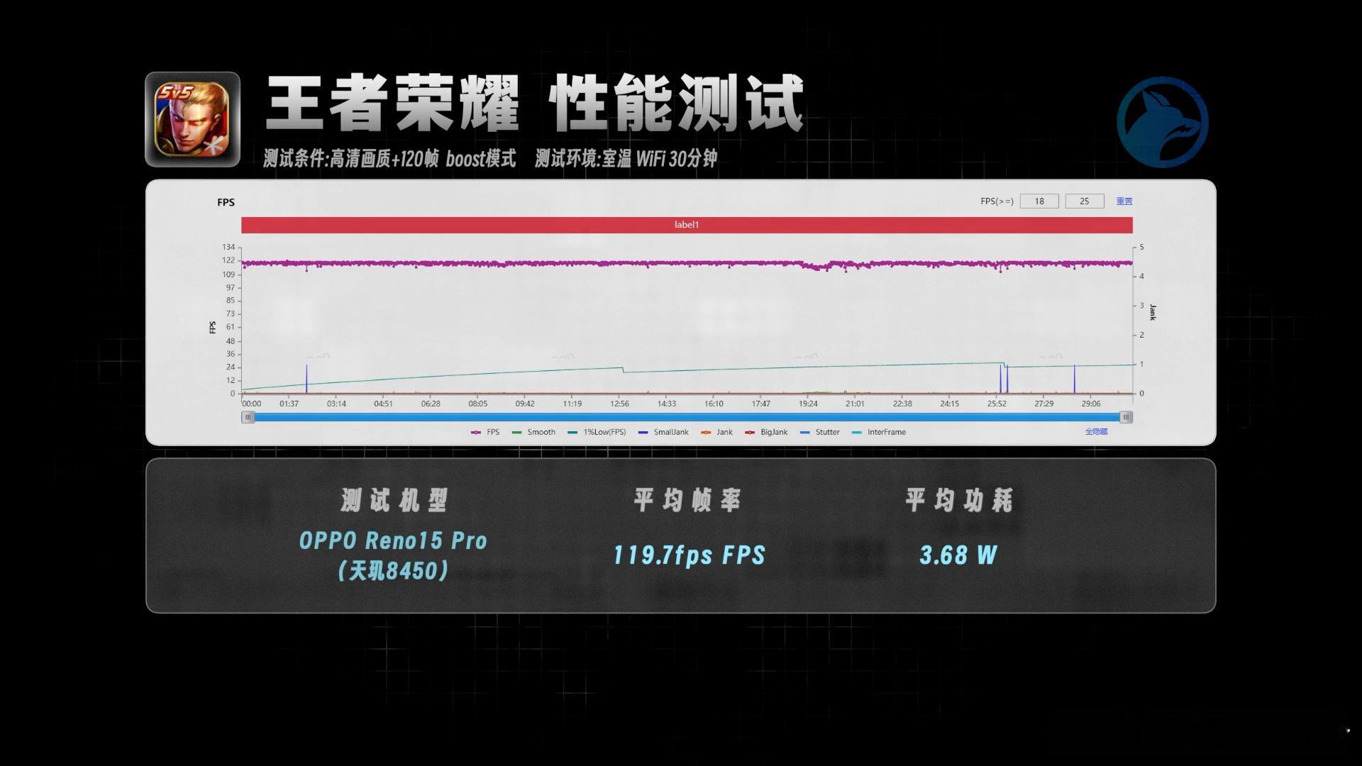 作为一年两更的机型作为主打拍照的机型作为时尚高颜值的女性向机型毫不意外,Reno15处理器和14一样,都是天玑8450(不知道期待什么)。性能咋样呢?我们实测了下,安兔兔200万出头(图1),王者高清+120fps几乎满帧,偶尔小波动但很稳定,玩起来不卡(图2)。但更高性能要求的游戏,对于8450就有点吃力了。日常使用倒还好,毕竟有机圈德芙ColorOS 16帮衬着,挺流畅的。这性能你们觉得如何?买手机会看处理器么?