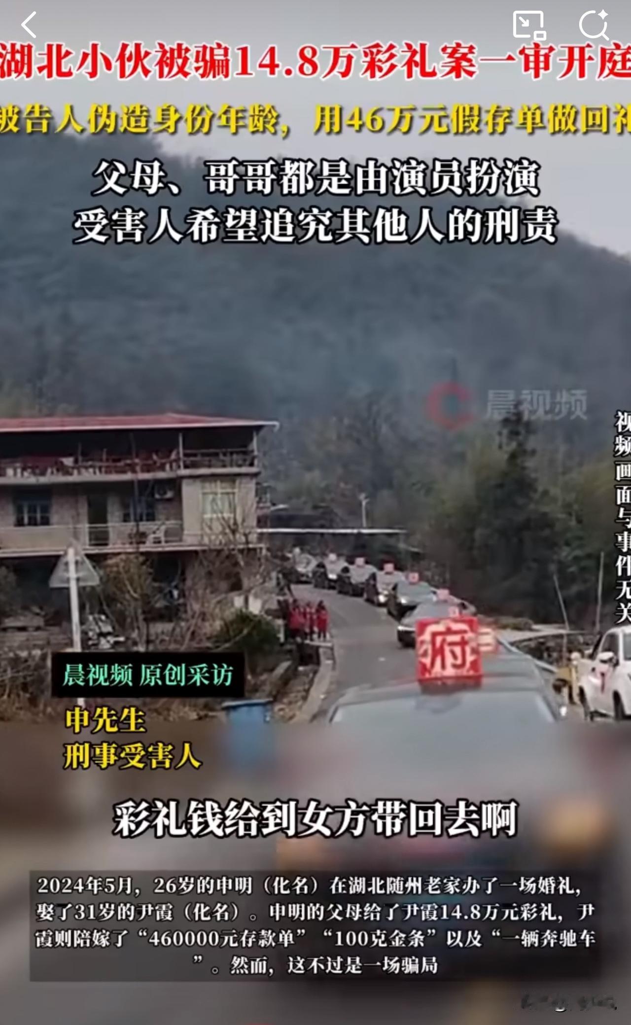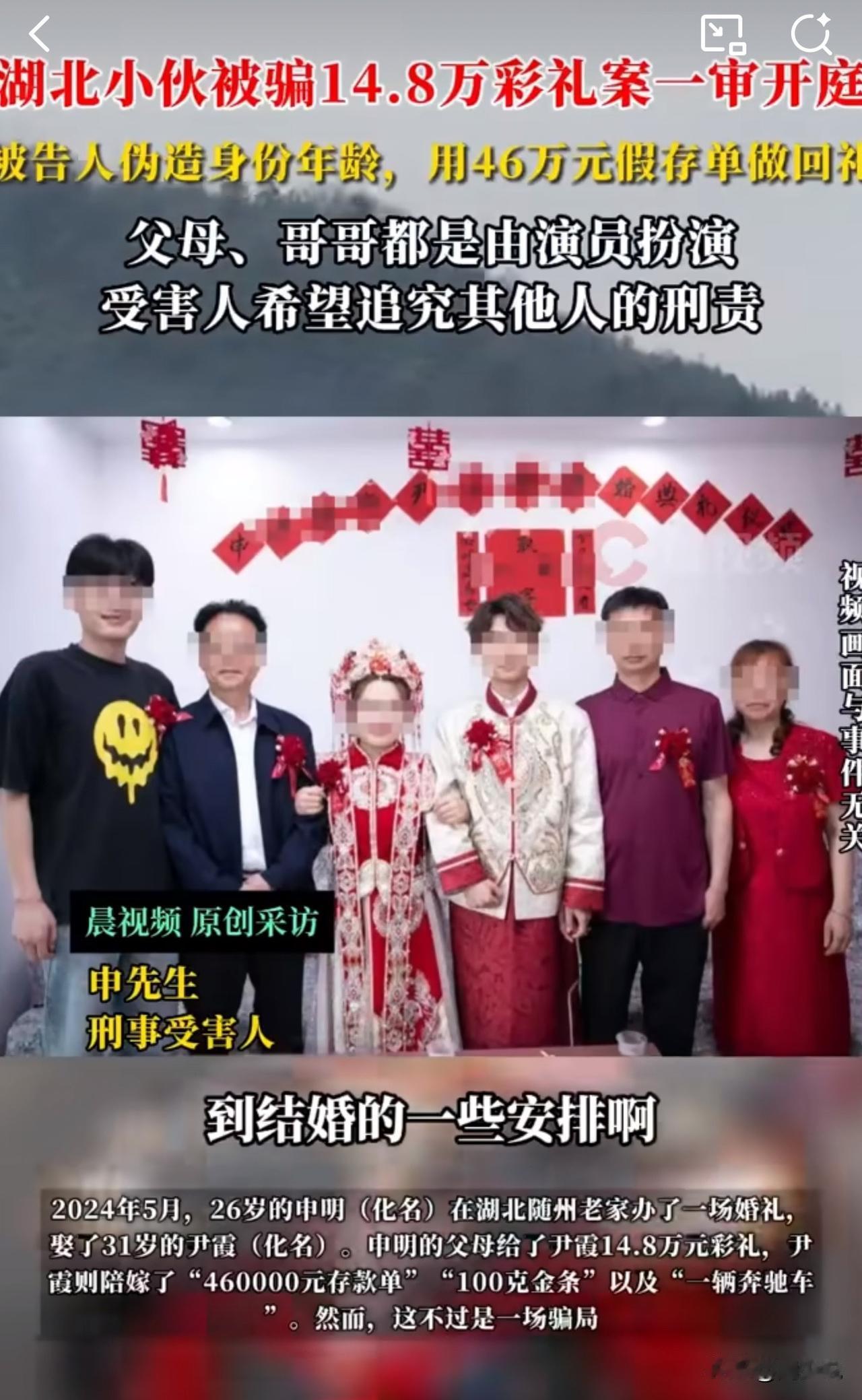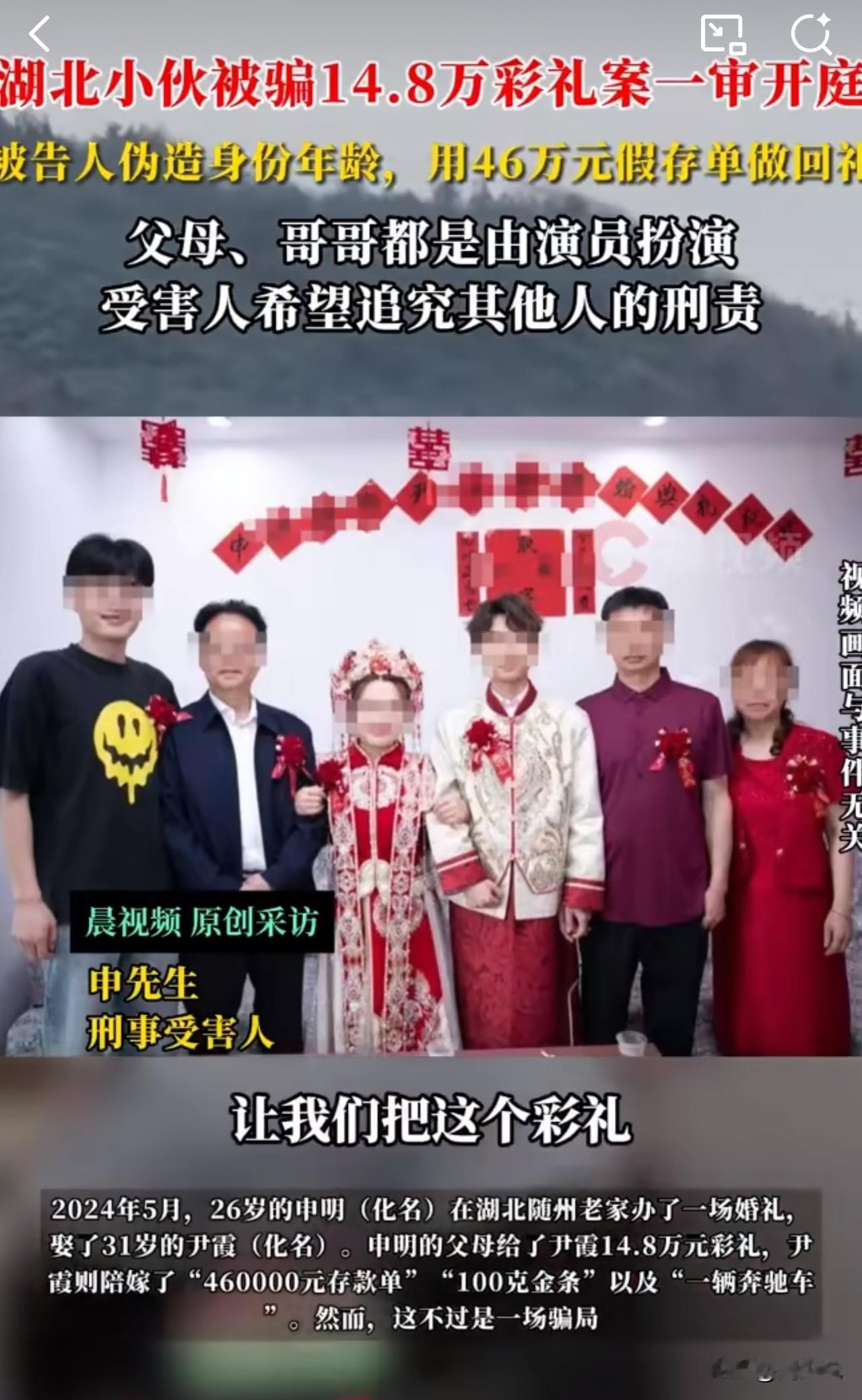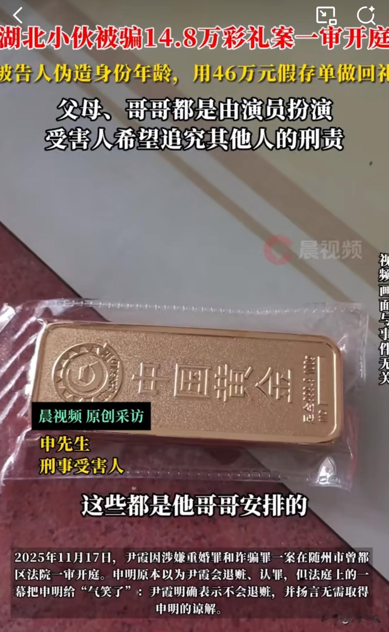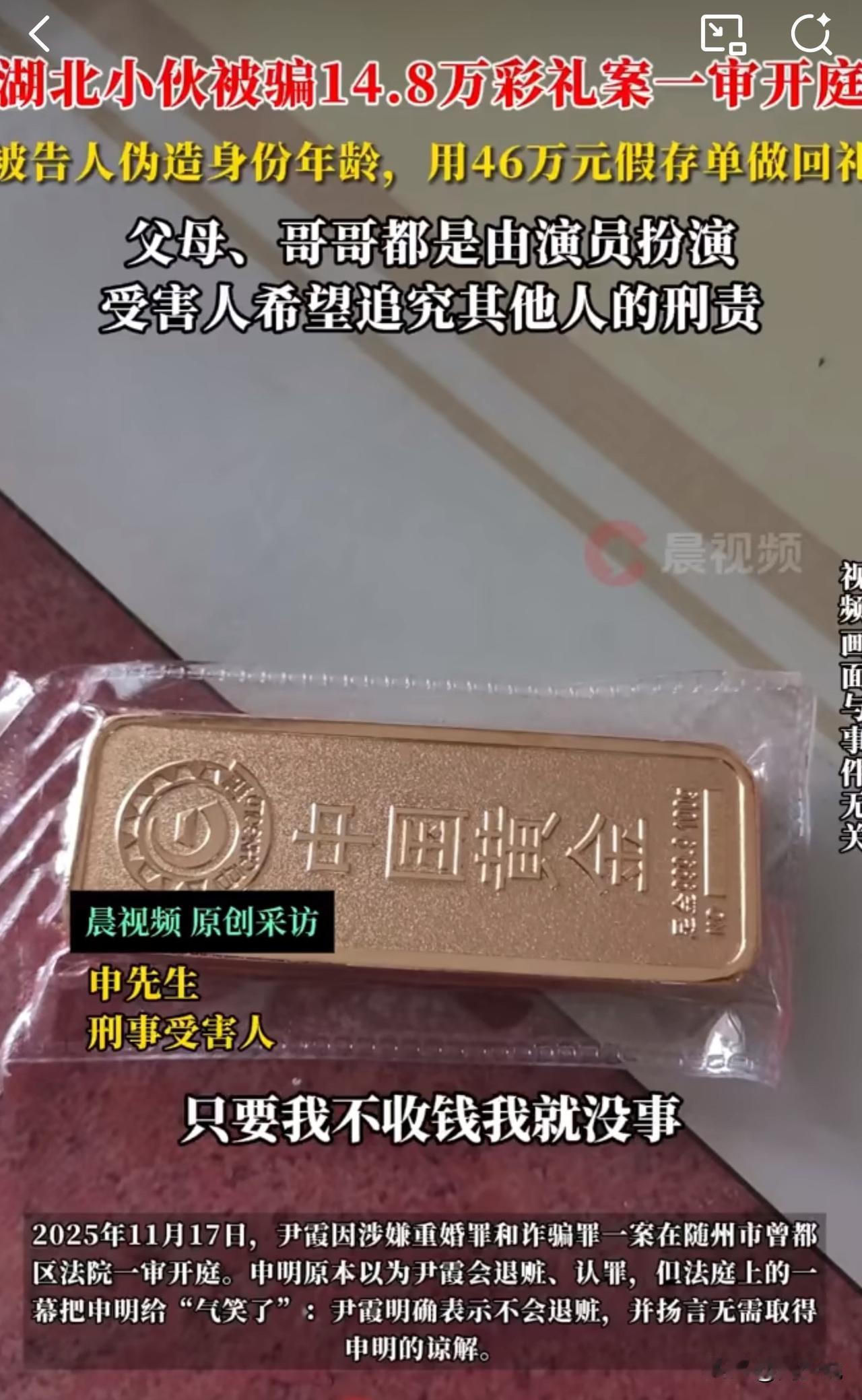 #MCN双量进阶计划#离谱!湖北小伙14万彩礼娶新娘,新娘尹霞号称陪嫁46万存单、100克金条和奔驰车,结果全是骗局,婚后发现女方全家是演员! 据媒体报道,2024年5月婚礼后,申明才发现新娘名字、年龄是假的,陪嫁存单和金条是网购假货,奔驰是租的,连婚纱照里的岳父母、调解矛盾的“哥哥”都是演员假扮。 更震惊的是,尹霞早已结婚,还多次用假B超单骗取信任。2025年11月17日案件一审开庭,尹霞不仅不认怂,还嚣张放话“不退赃、无需谅解”,把申明直接“气笑了”。 此事曝光后,引发众怒:“这骗局堪称现实版短剧,演技比演员还真!而且,14万是普通家庭的血汗钱,毫无悔意太过分!” 看完这事,周少想说这场骗婚确实很狗血,很离谱,这种只有在电视里面才看到的剧情,没想到现实生活中真实上演了。 这位女子用谎言编织美梦,既违背道德更触犯法律。婚姻的基础是真诚,任何妄图靠欺骗获利的行为,终将受到法律的严惩,期待法院给出公正判决,还受害人公道。#寻美三湘# #长沙新朋友#