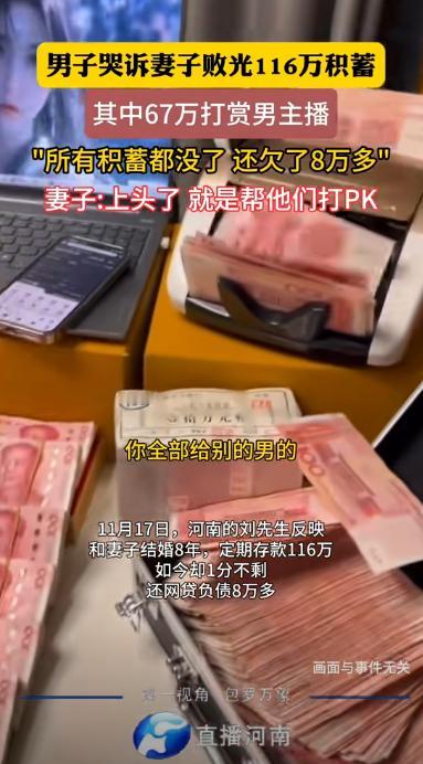天都塌了!河南郑州,一男子结婚8年,省吃俭用存了116万,他交给妻子保管,谁知查账时发现,妻子账上只有3毛钱,男子这才知道,67万被妻子打赏给了男主播,其余的钱,妻子支支吾吾说不清楚,男子还发现,不但积蓄没了,妻子还借了80000元网贷,妻子: 他叫我宝宝,忍不住上头了,男子大哭: 我那么相信她,钱都给了她,却落得这样下场… 郑先生(化名)最近遭遇了人生重击,他和妻子结婚八年,省吃俭用攒下 116 万,全交给妻子保管,图的就是夫妻间的信任,也方便家里统一理财,可前阵子对账时,他拿起存折、点开网银,瞬间懵了,账户里空空如也。 116 万不是小数目,郑先生赶紧追问妻子钱去哪了,妻子支支吾吾半天,才说出实话,67 万被她拿去给直播平台的男主播打赏了,剩下的钱去哪了妻子说不清楚,给不出让人信服的明细。 更让郑先生心寒的事,妻子还瞒着他办了八万多元的网贷,问起来,只说可能是为了继续打赏,也可能是日常花了。 面对郑先生的愤怒质问,妻子声音压得很低,解释说,“他叫我‘宝宝’,感觉被重视,情绪上就上头了。” 这话没让郑先生消气,反而更寒心。 他说,信任是夫妻过日子的根基,把所有钱交出去,是想着一起规划未来,没成想好好的家底子,被这么折腾没了,夫妻俩的关系,也从之前的安稳,一下子降到了冰点。 这事传开后,邻里和网友们看法不一样,有人特别同情郑先生,觉得妻子不跟商量就动夫妻共同的大额财产,还沉迷给主播打赏,把家里的利益都给损害了。 也有人关注到妻子的心理,说可能是她平时情感上有空缺,又对社交媒体上瘾,才做出这种糊涂事。 懂法律的人也给出了说法,结婚后的存款属于夫妻共同财产,一方没经过同意就挪用,得承担相应的民事责任,郑先生可以通过法律要回被侵占的钱。 至于那 8 万网贷,要是用来贴补家用,可能算夫妻共同债务,但要是明显是妻子个人的高风险消费,这笔债该谁还,就有的争了。 郑先生现在已经做好了打算,先尽量要回一部分被挪用的钱,之后准备离婚。 其实这事也给所有家庭提了个醒,家里的钱,透明很重要,也得有风险意识,夫妻可以商量着来,比如分个共同账户和个人账户,大的支出必须两个人都同意才行。 对网上消费、虚拟社交也得有戒心,平时多沟通,给消费设个限额,信任当然重要,但有监督、有规矩,才能真正保护好家里的共同利益。 郑先生现在的选择,是为之前的信任付出代价,也是为自己以后的生活负责,这场由直播间引发的家庭危机,真的值得每个人好好想想。 对此,你还有什么看法呢? (信息来源 :直播河南 )