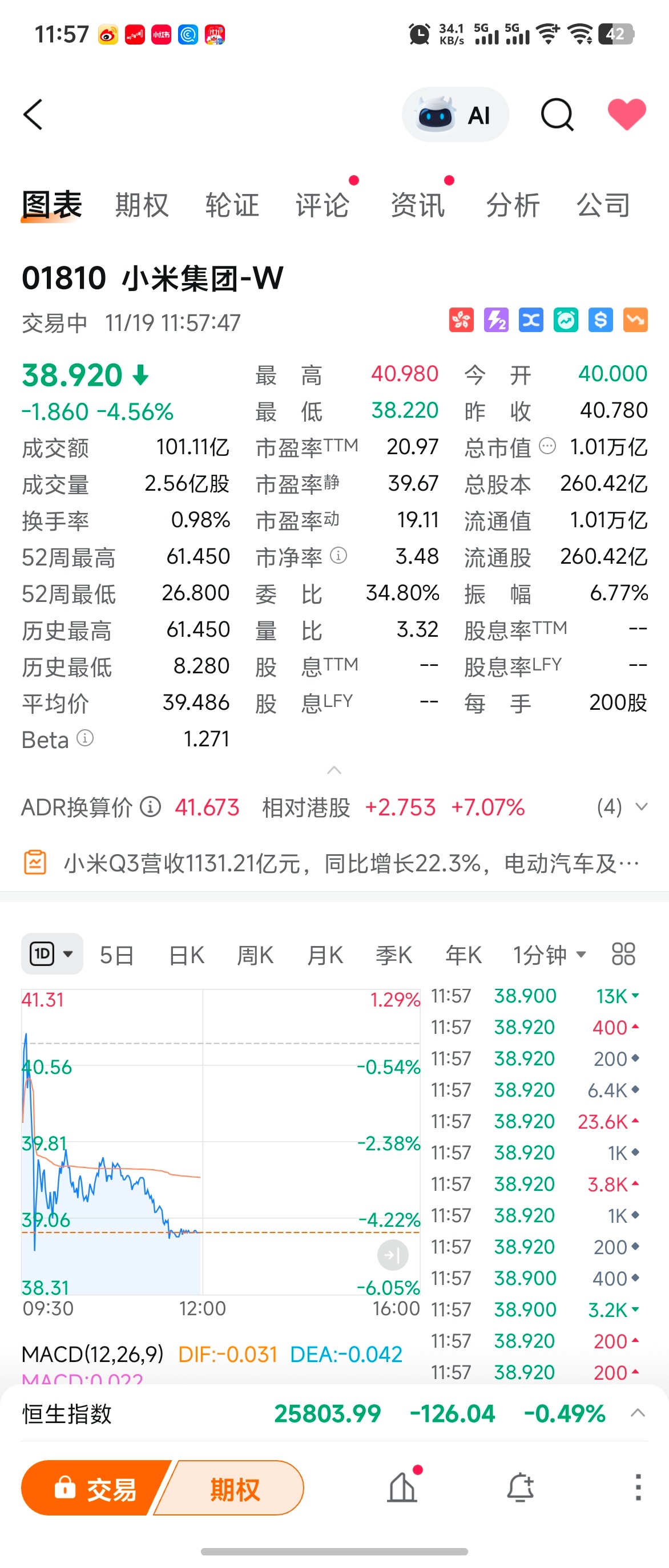 不想说话了,50到42都补了三次了,没想到现在都跌到38了,补不动了 一个小米一