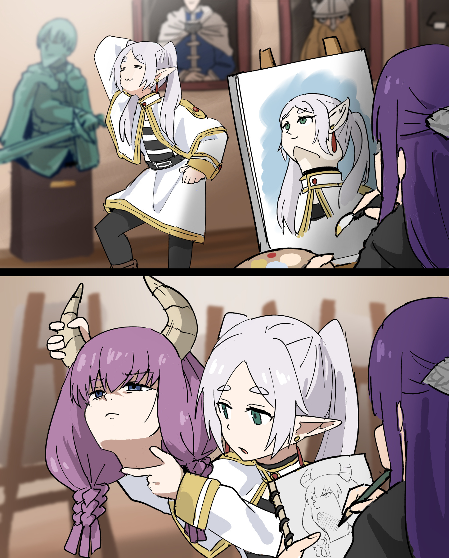 X上有位老哥画了一张昂起下巴的芙莉莲,因为刁钻的角度和逆天的透视而引发了大量二创,也有不少画师&漫画家用这个角度做了挑战,并给出了自己的正解