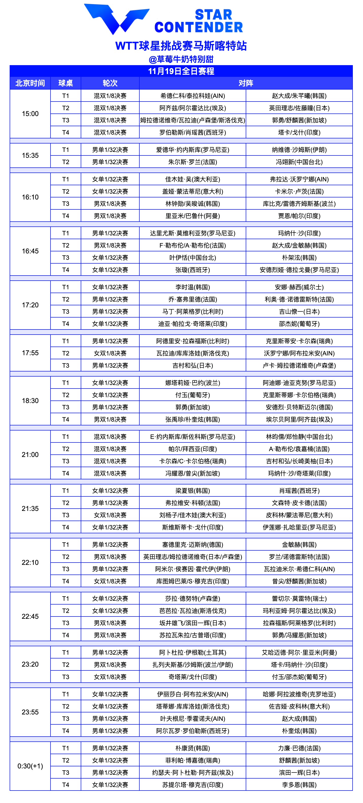 WTT球星挑战赛马斯喀特站丨11月19日全日赛程男女单打种子首轮轮空