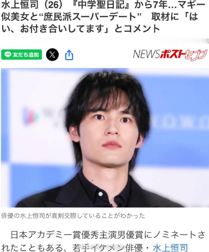 据日媒,水上恒司(26岁)与长得像模特マギー的年上女友牵手约会,面对采访,水上大方承认事实“是的,我们正在交往,没有什么好隐瞒的”。帅哥恋爱了!!