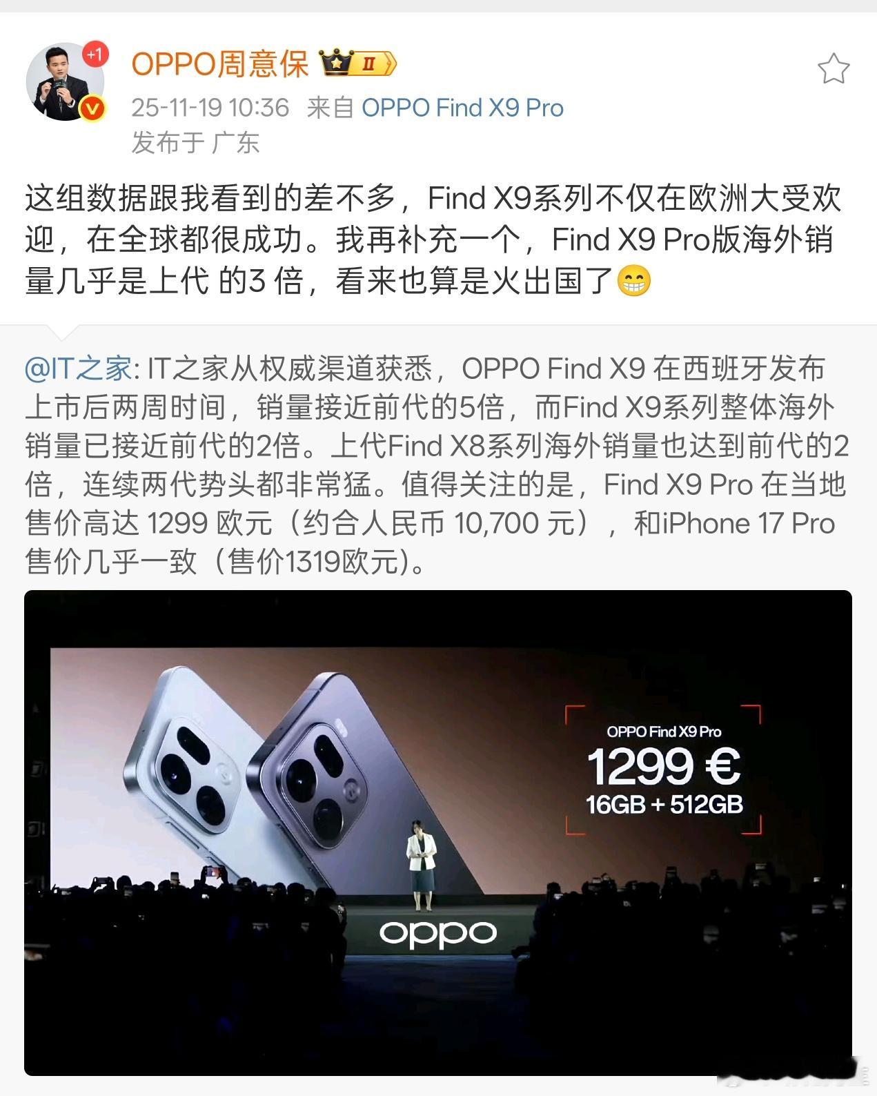 OPPO Find产品线负责人:Find X9 Pro海外销量几乎是上代的3倍。