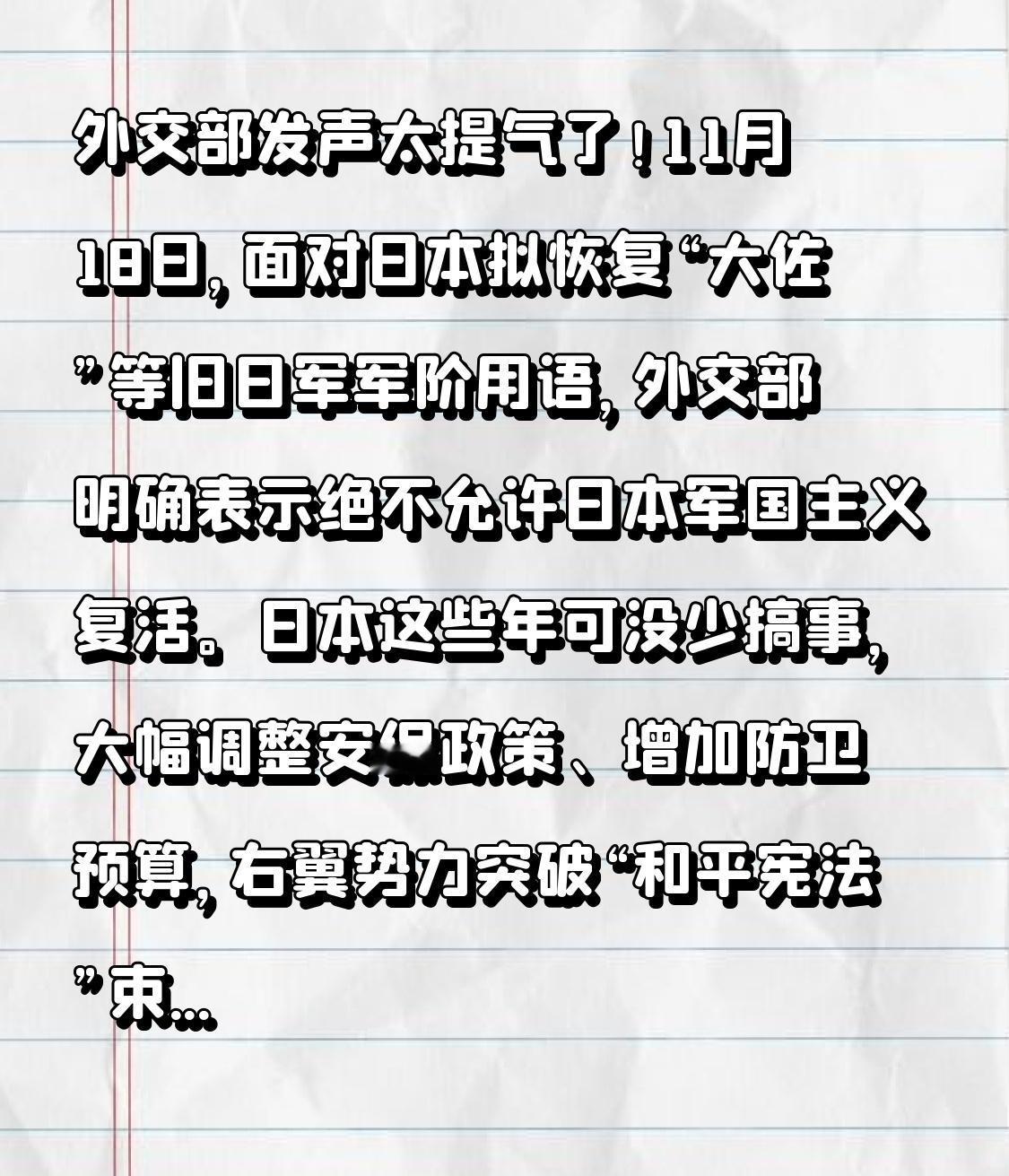 外交部发声太提气了!11月18日,面对日本拟恢复“大佐”等旧日军军阶用语,外交部明确表示绝不允许日本军国主义复活。日本这些年可没少搞事,大幅调整安保政策、增加防卫预算,右翼势力突破“和平宪法”束缚,强军扩武野心昭然若揭。当年日本军国主义的侵略,给亚洲和世界带来了多大灾难,这历史教训绝不能忘。 或许是受此影响,国内赴日旅游出现“退团退票潮”,大家都用行动表达态度。日本多地知事也表态了,不知道他们是真认识到问题,还是做做样子。但我们必须坚定立场,守护世界和平稳定。