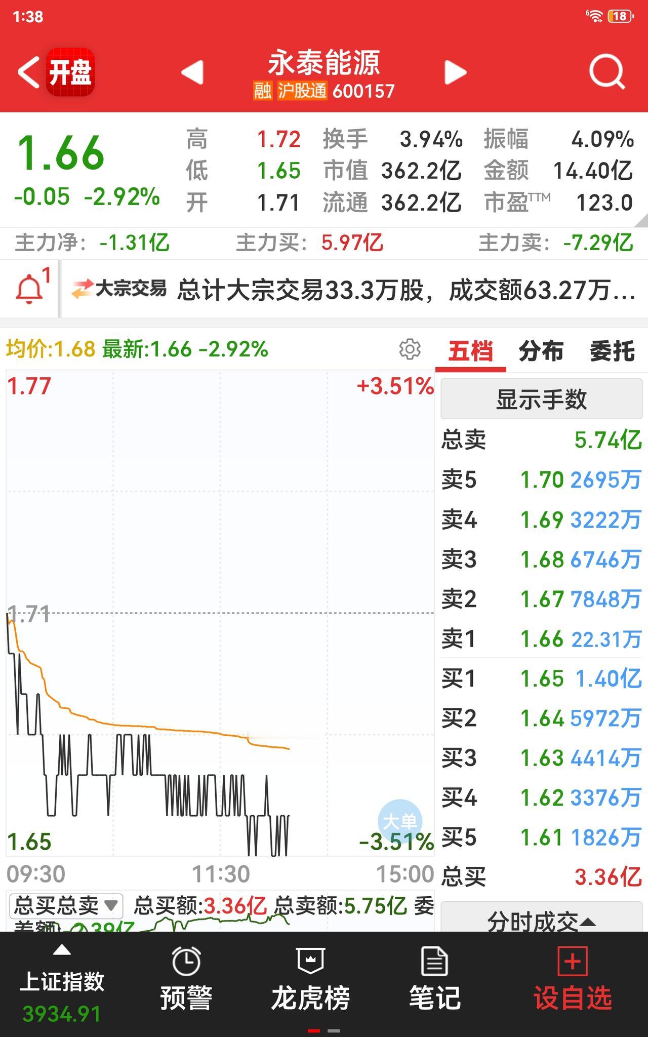 今天奶奶赔得血本无归,足足亏了三万多块。昨天还幻想着能赚个五万八万,如今这美梦彻底成了泡影。 今天我持有的永泰能源,又回到了原点,一个涨停板的涨幅眨眼间就跌没了。这主力到底怎么回事,难道吸筹还没吸够吗?股价在两毛钱的区间徘徊了大半年,利好消息接二连三,可就是不见涨。扛着吧,坚决不卖,我就不信它涨不起来。