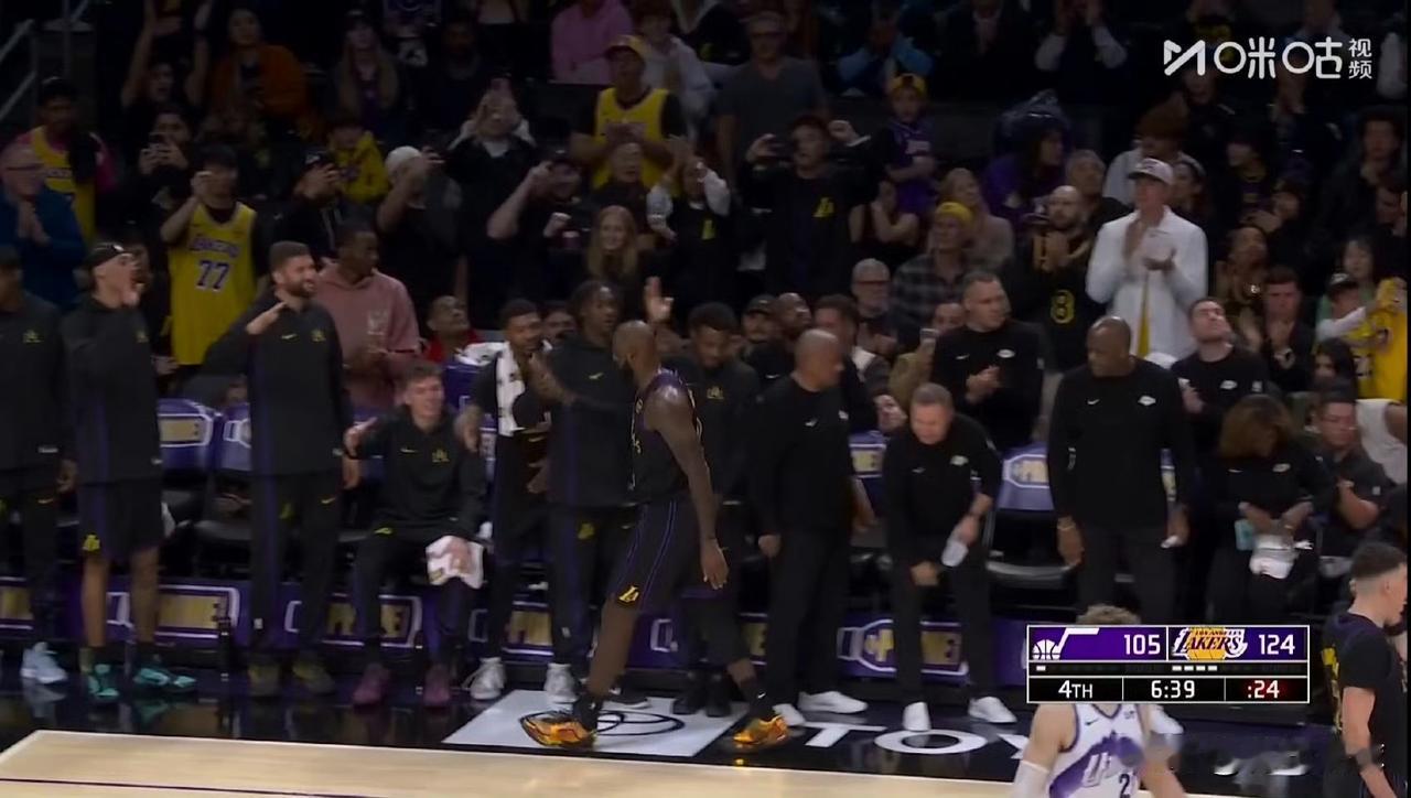 英雄!全场掌声给到詹姆斯! 第四节6分39秒,詹姆斯被换下场休息,全场观众和替补席、教练组起立为他鼓掌。关键的第三节末和第四节初,詹姆斯连续送出6记助攻,帮助球队将领先优势扩大至19分,直接打花了比赛,这就是全场观众为詹姆斯鼓掌呐喊的原因。 本场比赛,詹姆斯轻松拿下11分12助攻的两双数据,依旧是那个无所不能的詹姆斯!