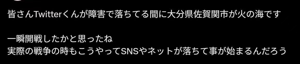 昨天推特崩了的时候,日本大分县火灾,图二网友调侃:Twitter君因残疾崩的时候,大分县佐贺关市陷入火海,我还以为是瞬开战了呢,实际战争的时候也是这样的,SNS和网络都是这样开始的吧?
