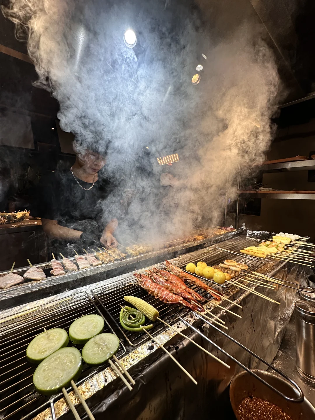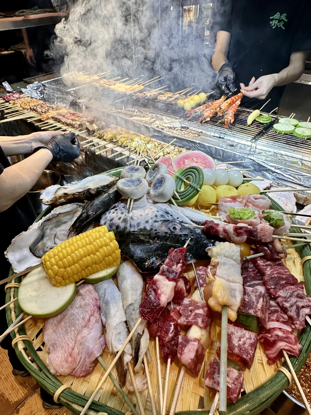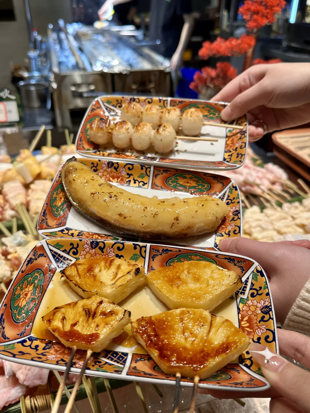和普通烧烤不一样!串烧种类巨多很丰富! 安格斯谷饲牛肋条焦香爆汁,彩椒牛肉粒鲜辣爽口,紫苏鸡皮虾🍤很有特色,鲜甜弹牙,桂花香蕉、焦糖芭乐、焦糖菠萝🍍都好好吃!甜而不腻很难拒绝!杭州杭州探店日料串烧日料探店氛围感