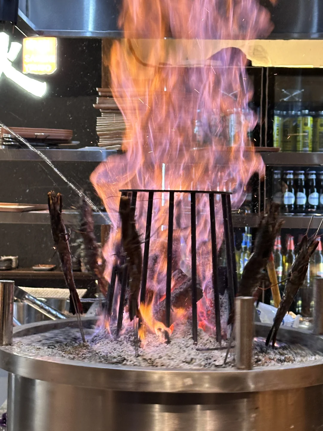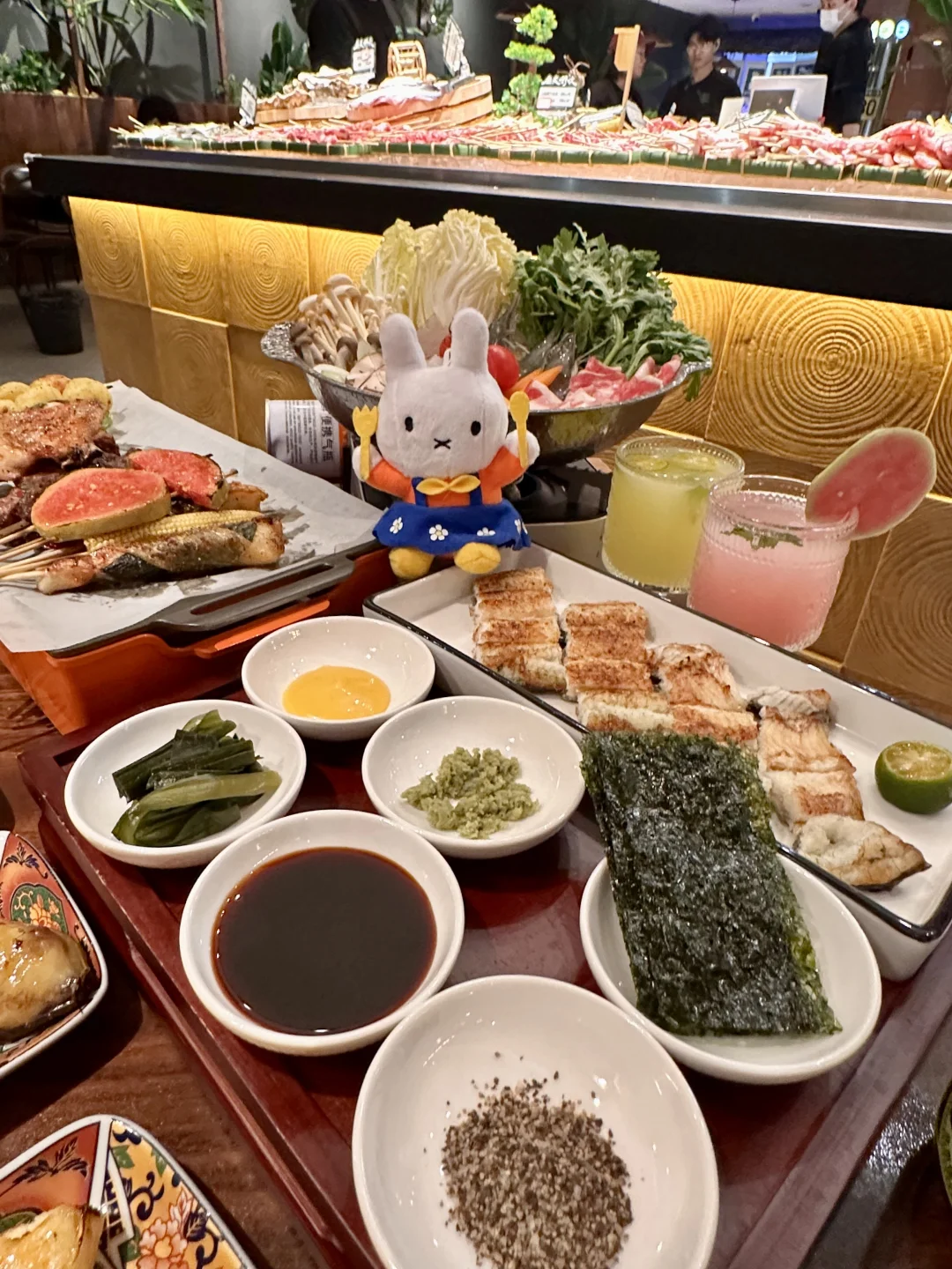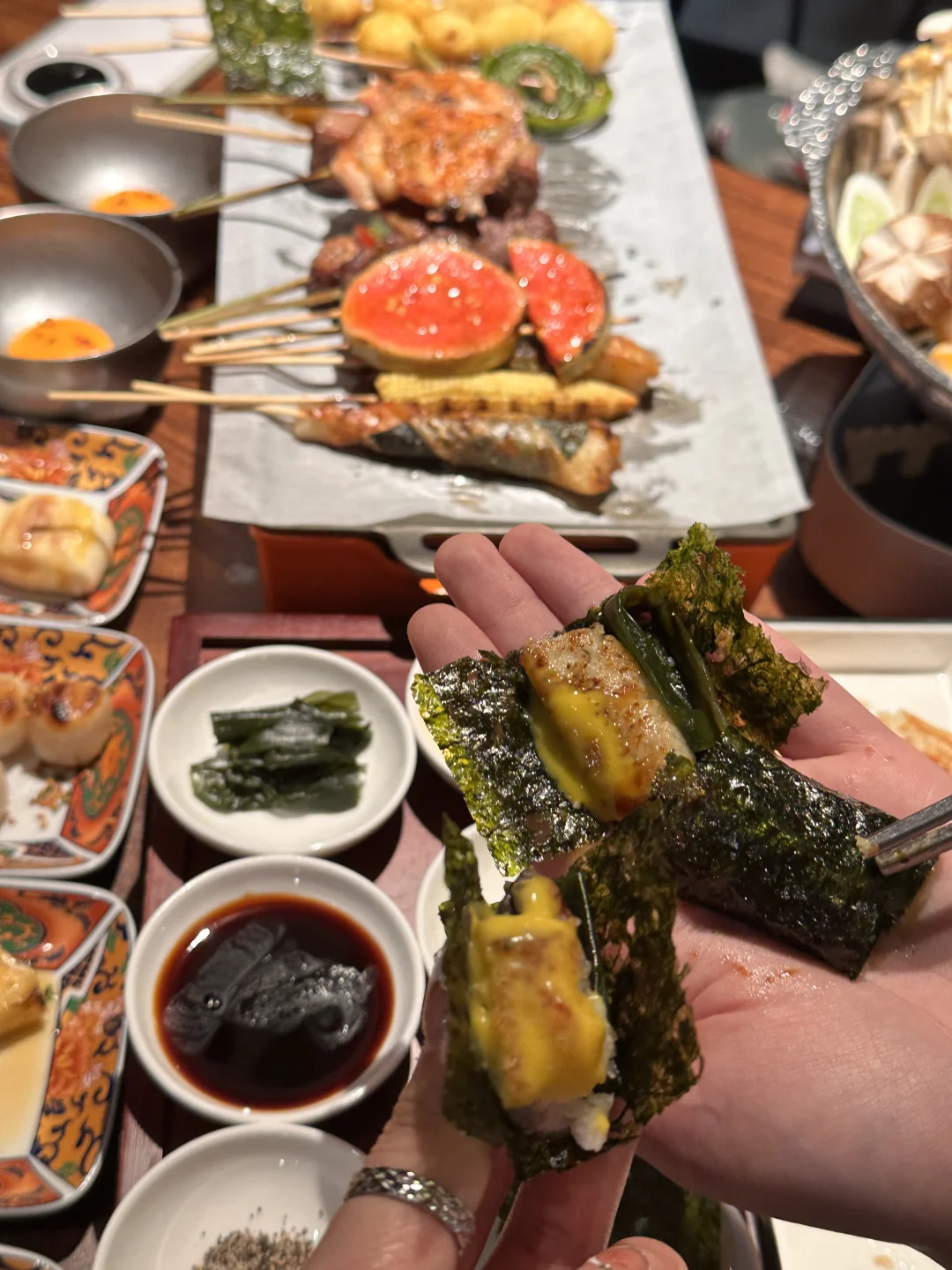 和普通烧烤不一样!串烧种类巨多很丰富! 安格斯谷饲牛肋条焦香爆汁,彩椒牛肉粒鲜辣爽口,紫苏鸡皮虾🍤很有特色,鲜甜弹牙,桂花香蕉、焦糖芭乐、焦糖菠萝🍍都好好吃!甜而不腻很难拒绝!杭州杭州探店日料串烧日料探店氛围感