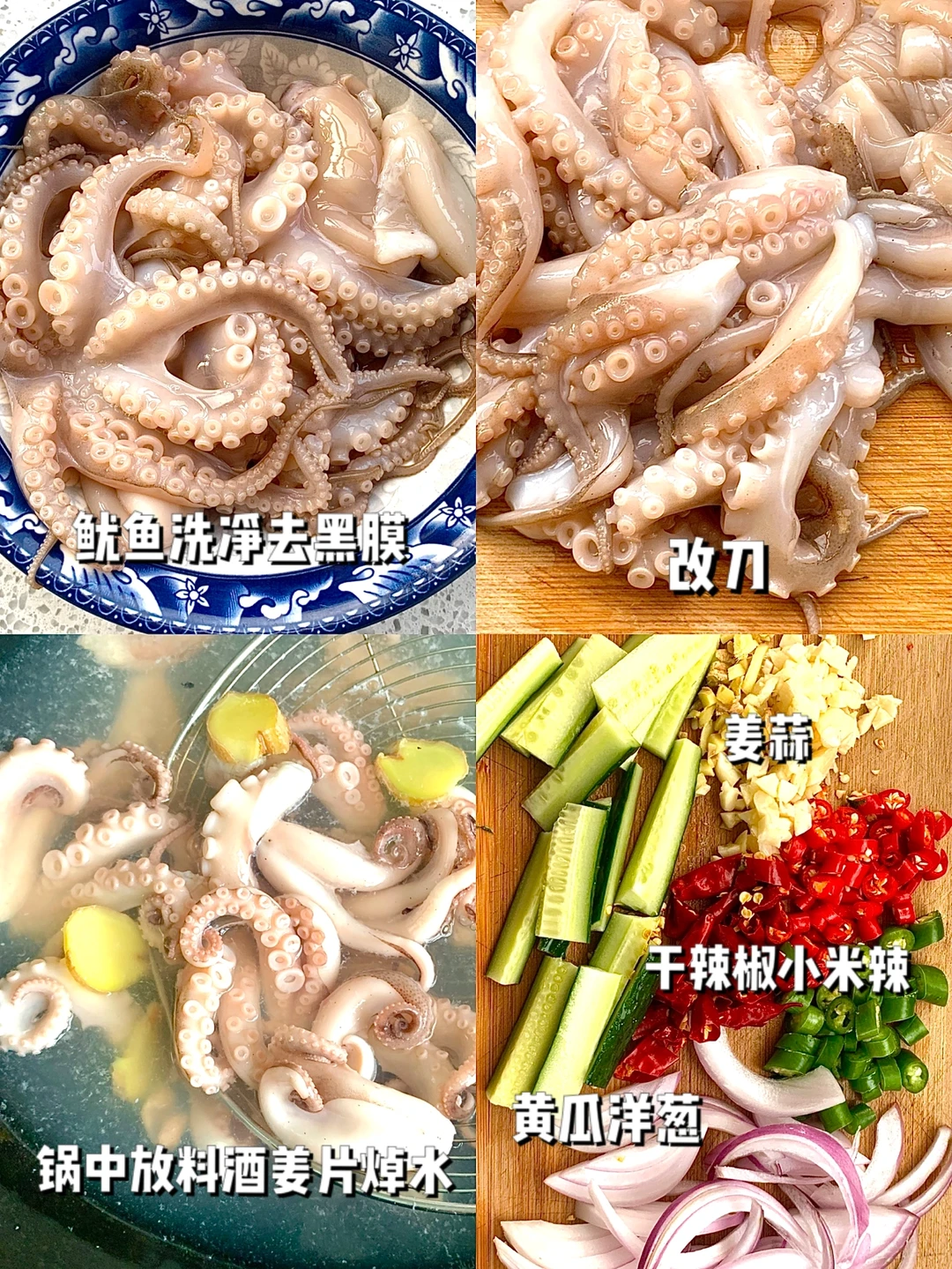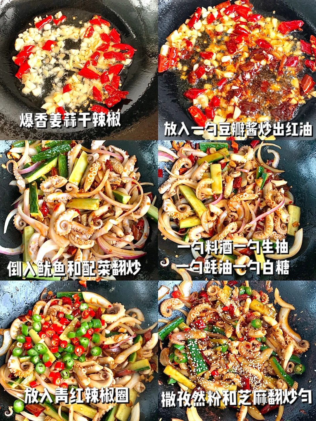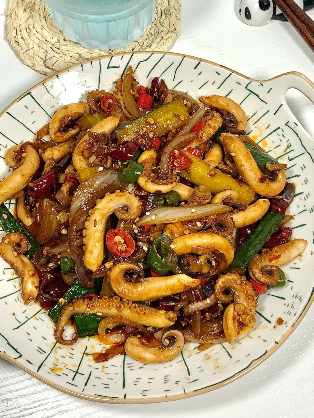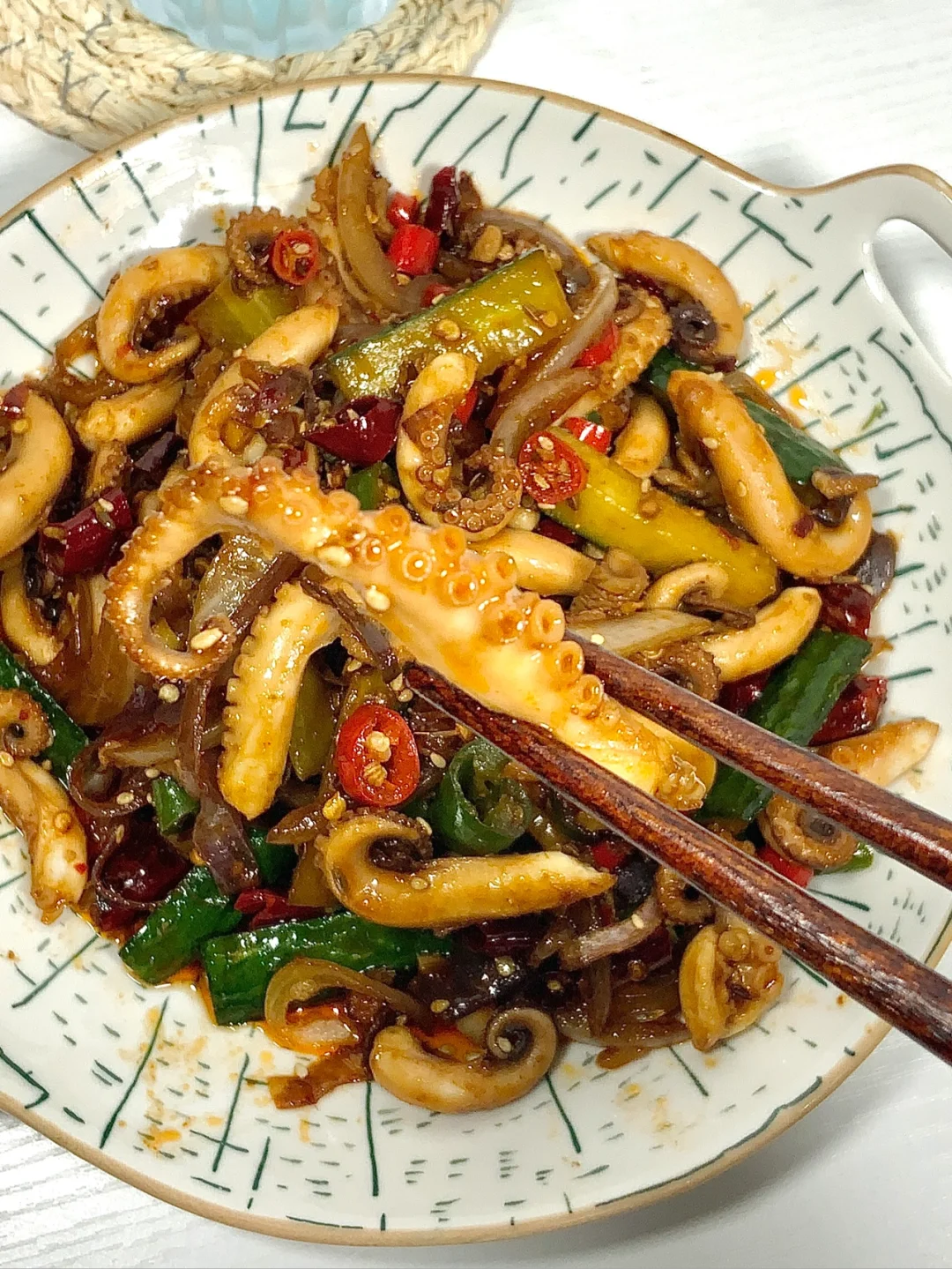 孜然味十足🌶️香香辣辣的干锅鱿鱼须🦑 - 食材篇🥬: 鱿鱼、姜蒜、干辣椒、 小米辣、黄瓜、洋葱、 孜然粉、豆瓣酱 步骤篇🥣: 1、鱿鱼洗净去黑膜,改刀,锅中烧水放姜片、料酒,将鱿鱼焯水 2、锅中烧油,放入姜蒜、干辣椒爆香,放入一勺豆瓣酱炒出红油 3、倒入鱿鱼和配菜一起大火翻炒,放入一勺料酒、一勺生抽、一勺白糖、一勺蚝油翻炒均匀 4、最后放孜然粉白芝麻,翻炒均匀出锅✅ - 干干香香🦑孜然味的鱿鱼须🌶️超级下饭🍚快来试试吧