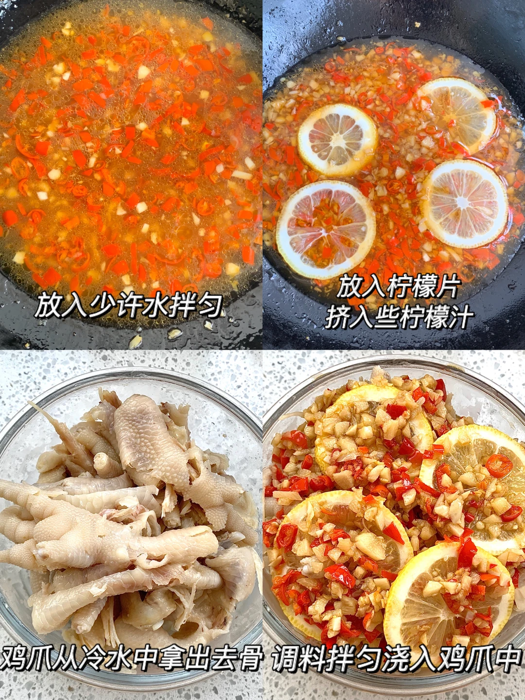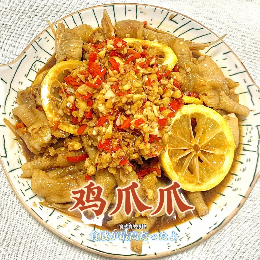 年夜饭中少不了的开胃凉菜来咯!酸酸辣辣柠檬味的鸡爪爪🐣🐥 食材篇🥬: 鸡爪、蒜、小米辣、柠檬 步骤篇🥣: 1、鸡爪剪去指甲,放入葱姜料酒,煮10分钟后捞入凉水中冰半个小时 2、小米辣、蒜切碎,锅中热油爆香后关火 3、放入料汁㊙️:一勺生抽、半勺老抽、一勺蚝油、一勺醋、一勺香油、一勺糖 4、放入少许开水拌匀,放几片去籽柠檬片,挤入些许柠檬汁 5、鸡爪冷水捞出去骨,料汁淋入拌匀,放入冰箱冷藏两个小时就完成了✅